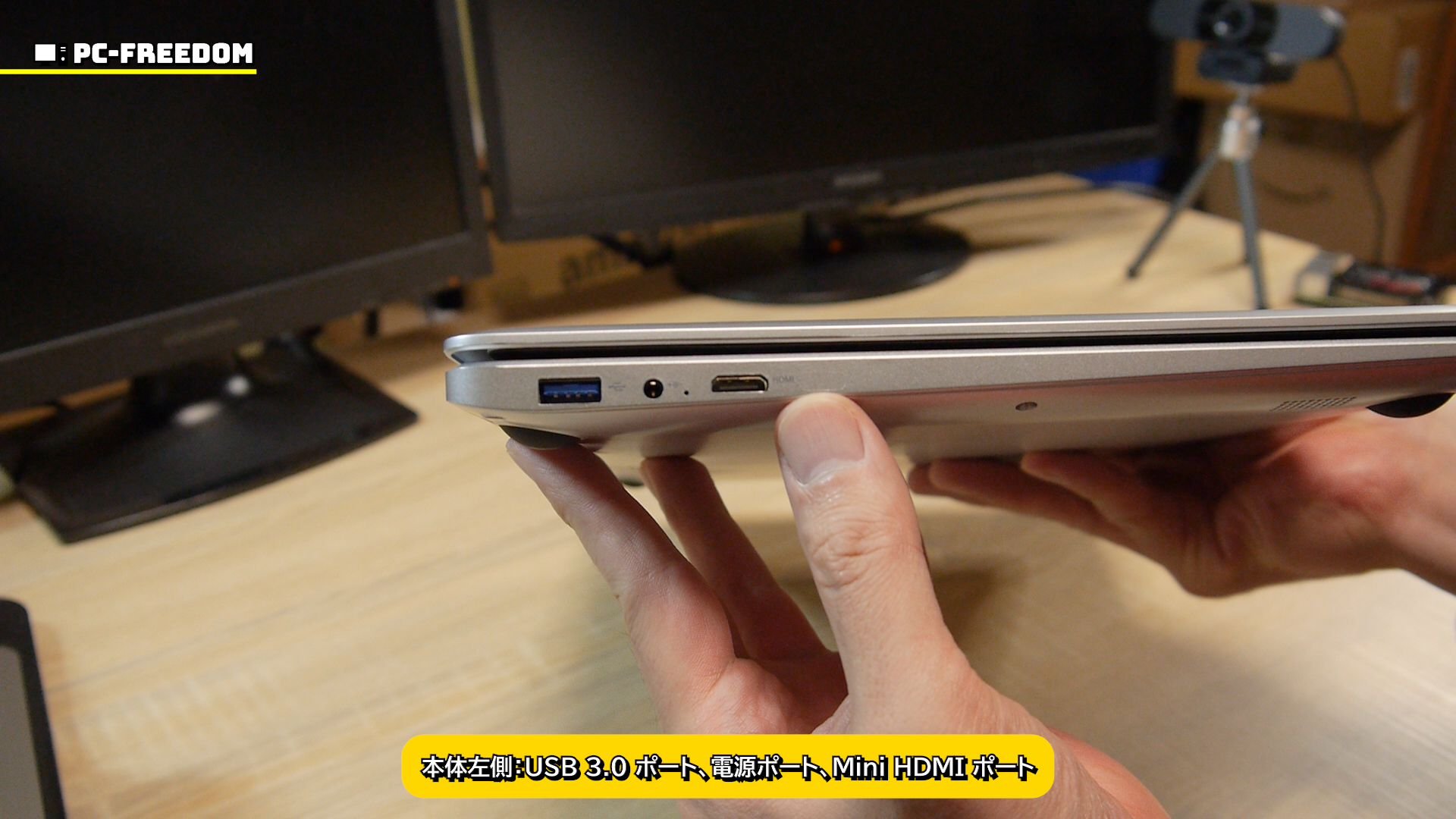 本体左側には USB 3.0 のポートと、電源ポート、Mini HDMI ポートが一つずつ。