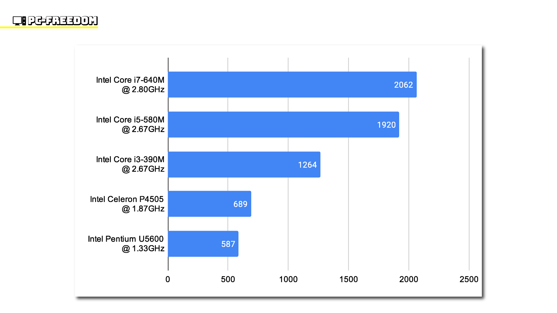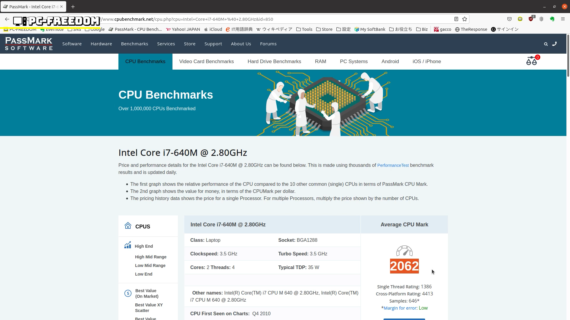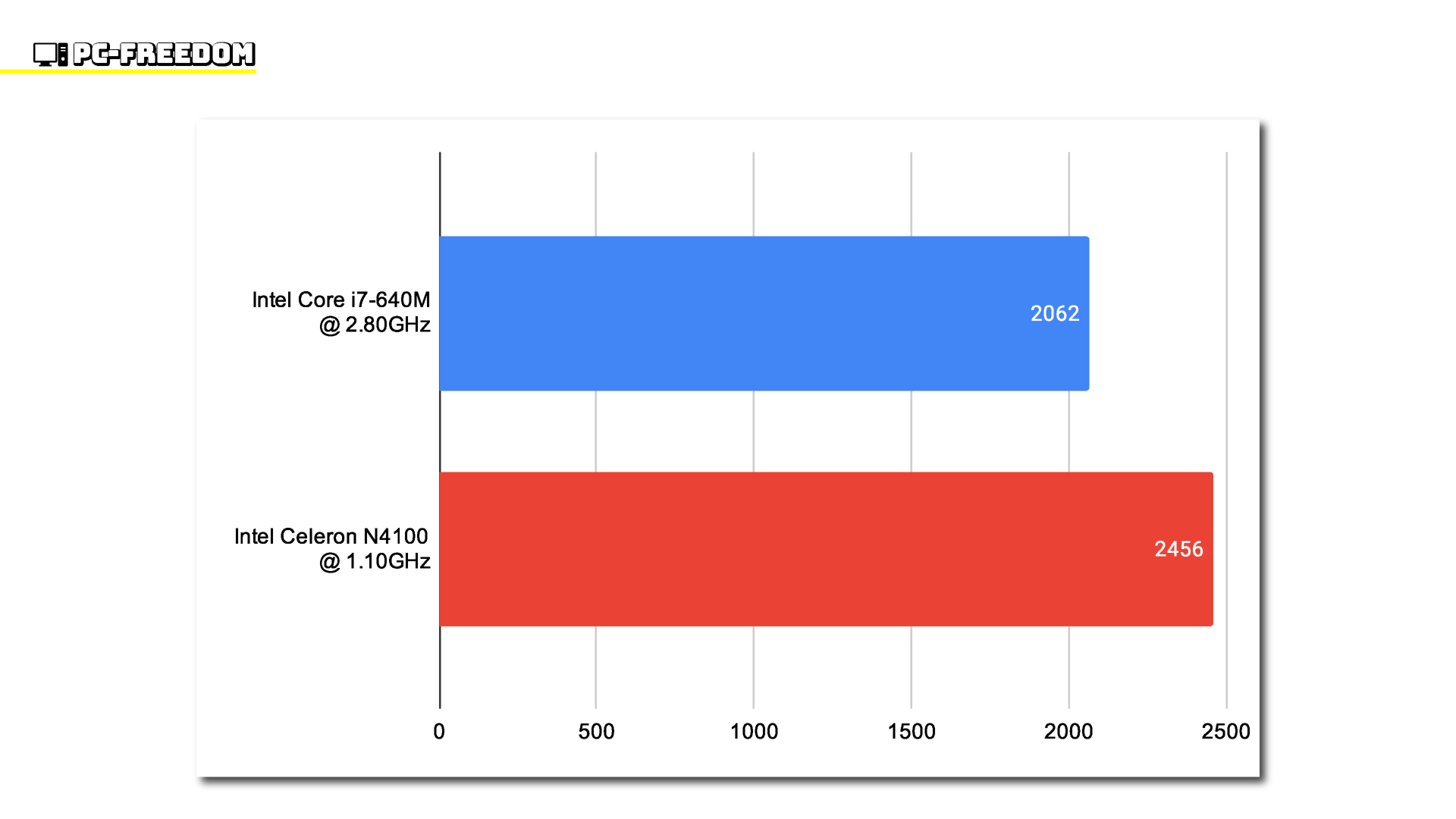 実際に、Core i7-640M と Celeron N4100 を PassMark のスコアで比べてみたところ Celeron N4100 の方が高いスコアとなっていました。