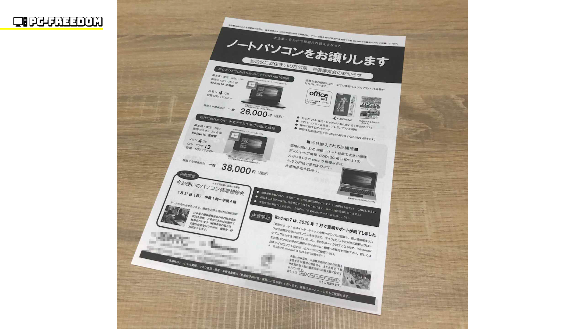 最新の Windows10 搭載!とされていた PC は、世代もわからない Core i3 (ステッカーのデザインを見ると第3〜4世代くらいのやつ)RAM はなんと4GB で、SSD 120GB というのがせめてもの救いではないでしょうか。