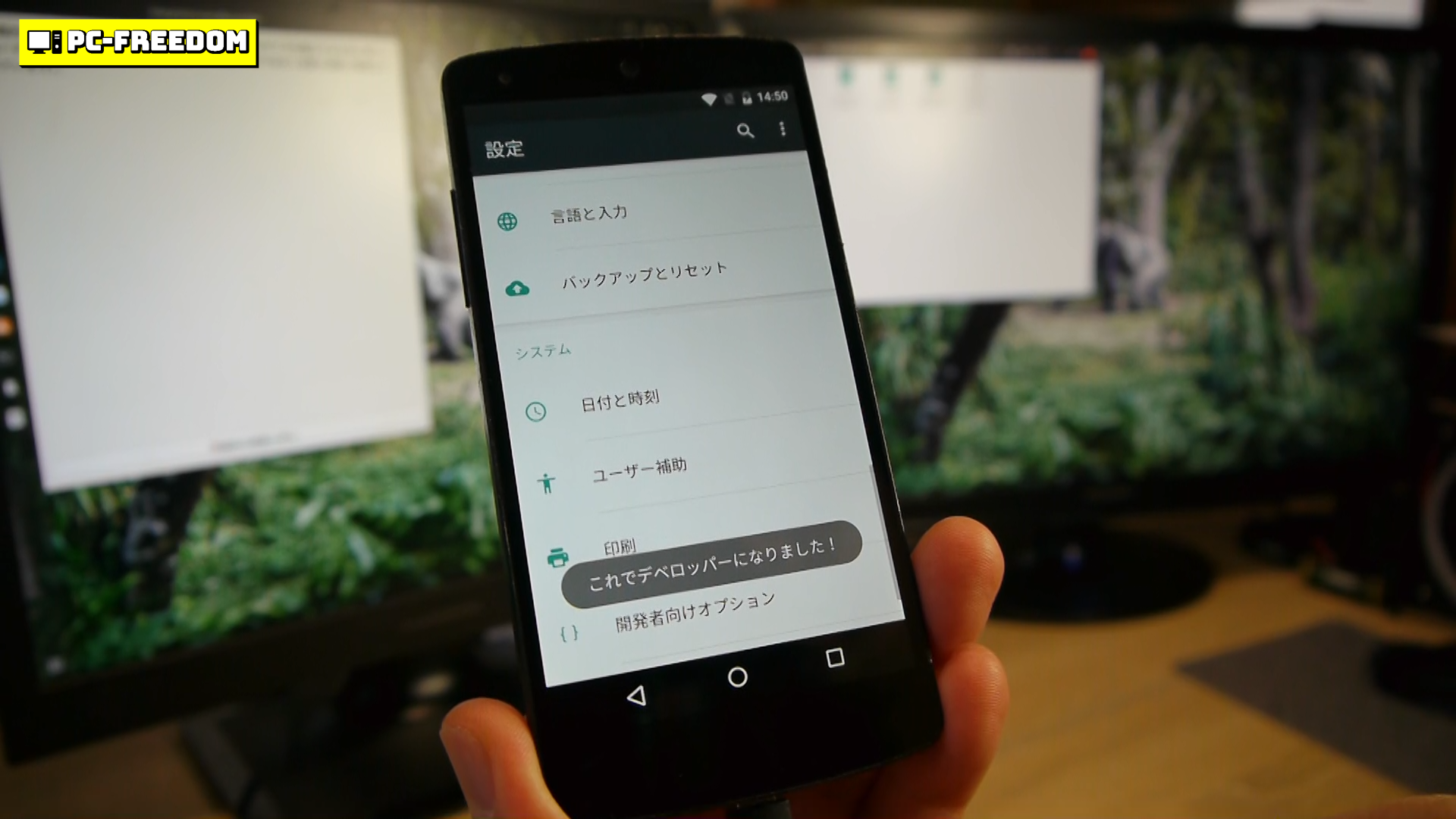 Nexus5 の場合、「設定」>「端末情報」>「ビルド番号」を7回タップ。