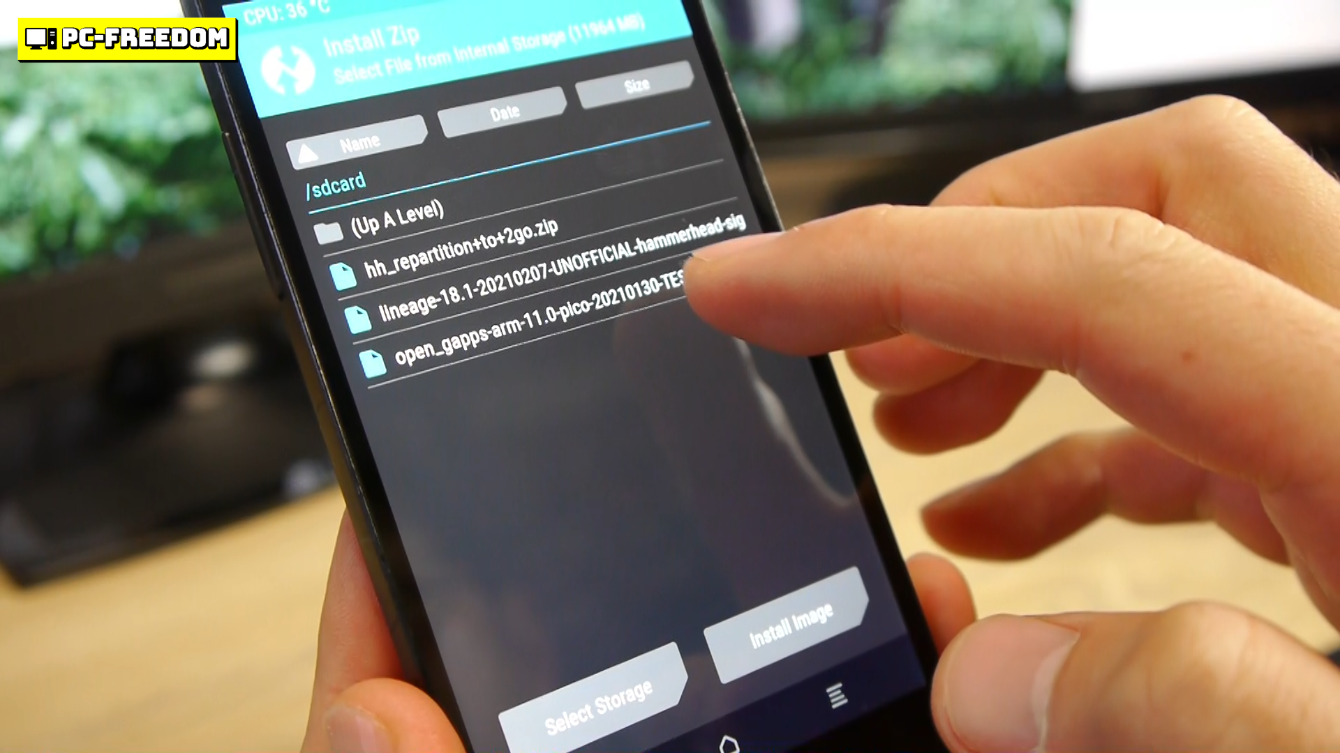 転送が完了したら、先程のように TWRP の「Install」をタップし、転送した LineageOS をタップ。