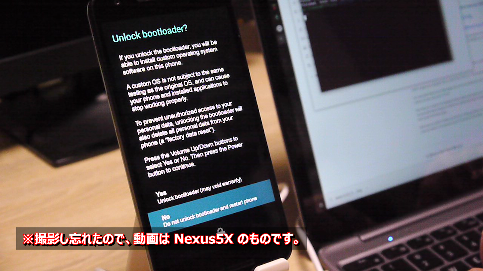 すると Nexus5 側では「Unlock bootloader?」という、英文だけの画面が表示されます。