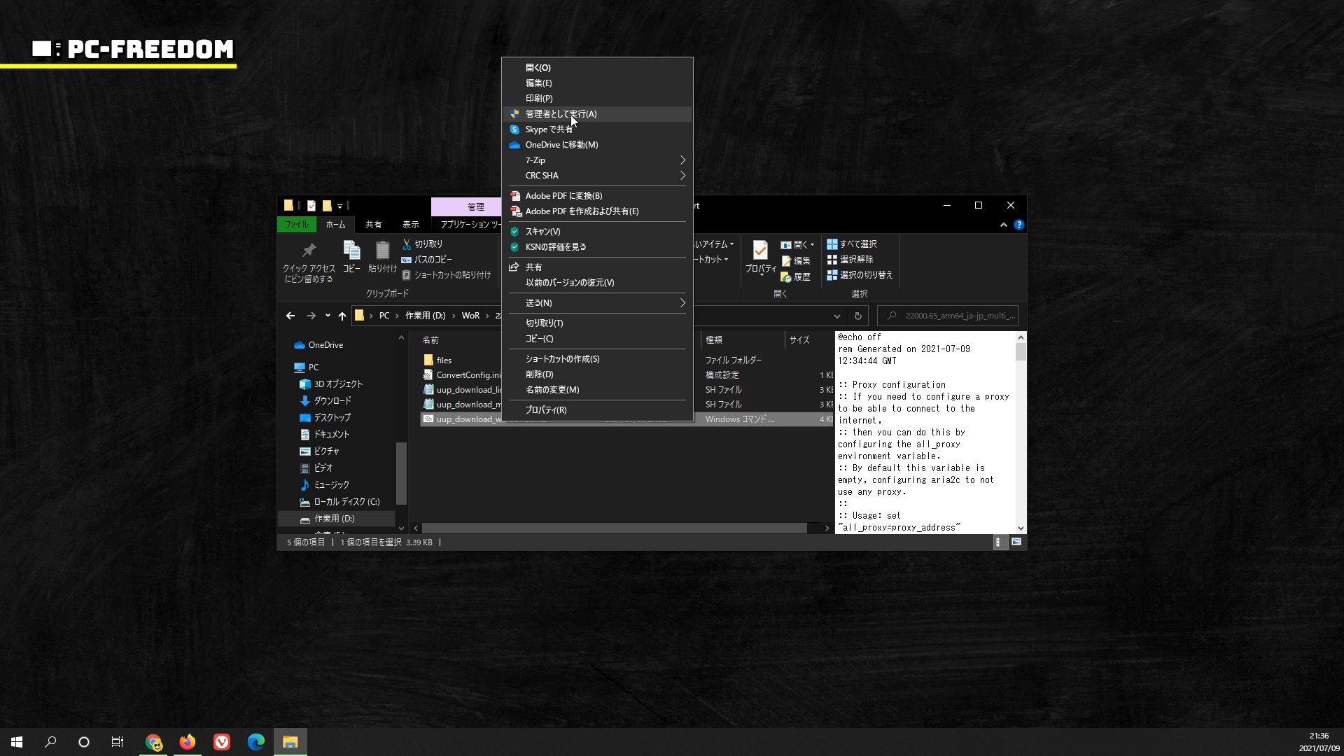 ダウンロードした CMD ファイルを実行するには、右クリックメニューから「管理者として実行」を選択します。