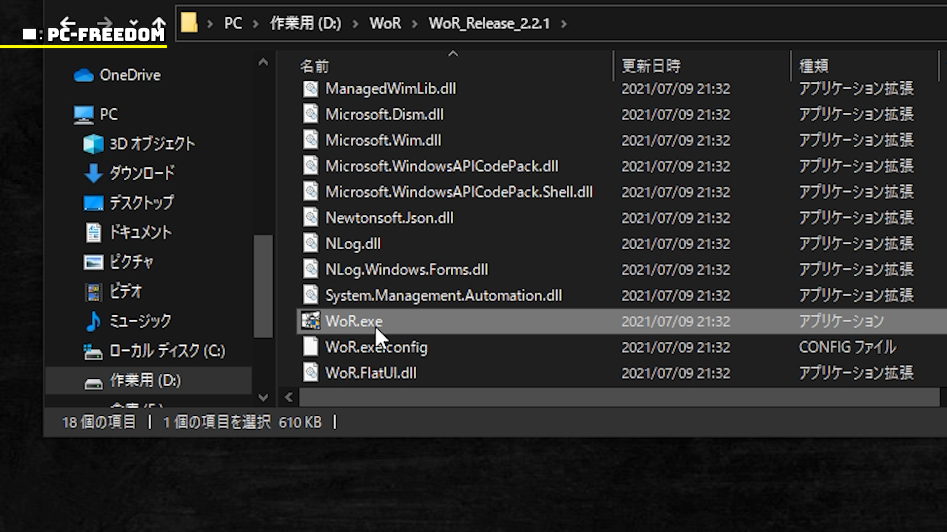 ダウンロードと展開が終わったファイルの中から「WoR.exe」を見つけ出しダブルクリックで起動させます。