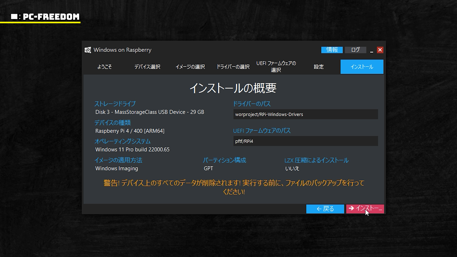 目立つように警告文が表示されていますが、コレ用に用意した microSD なので「インストール」をクリックして先に進めます。