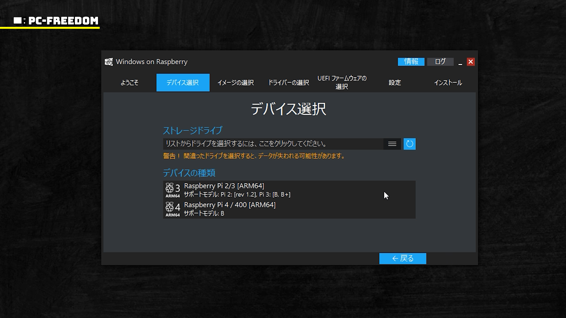 デバイスの選択では、上段の窓にインストール先のストレージを選択、下段の窓で表示されている RasPi のモデルをクリックします。