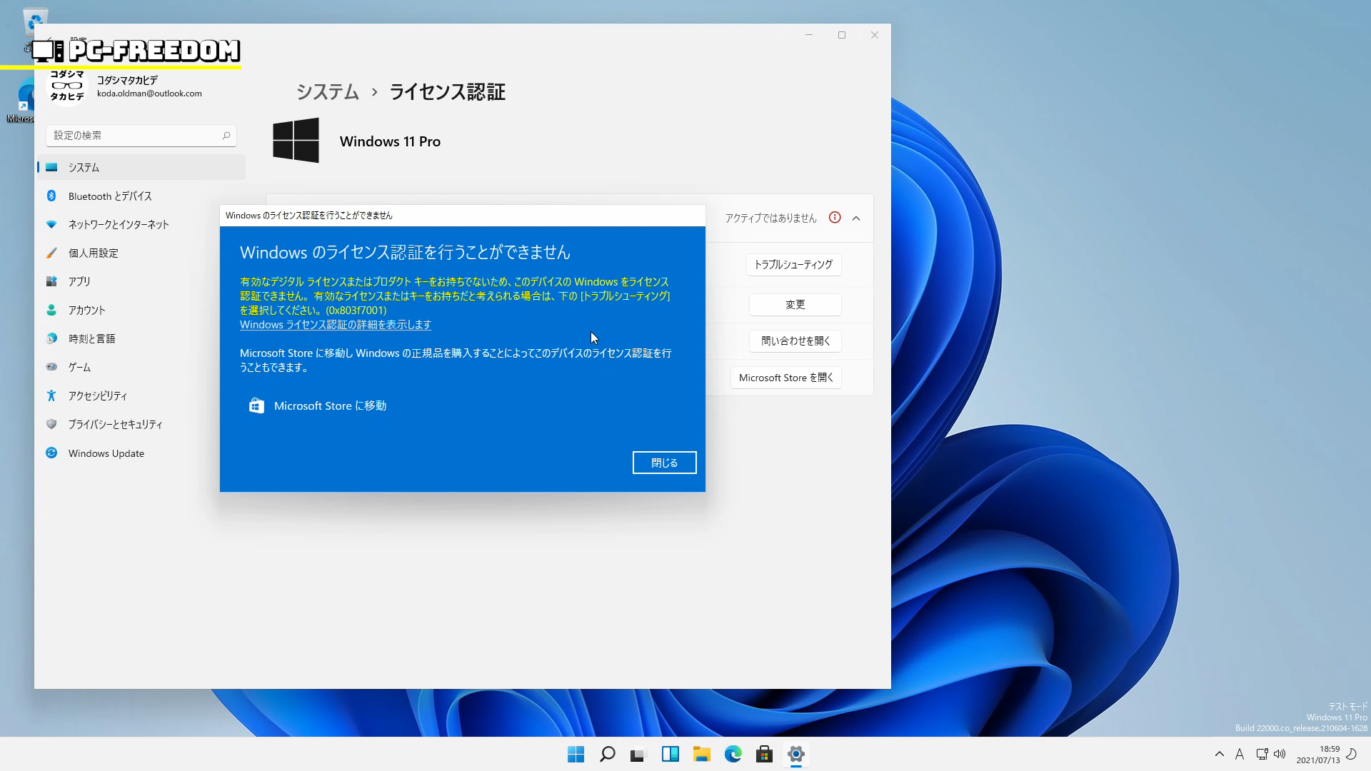 それでも Windows 11 が起動していちばん最初に、気になっていた Windows 7 のライセンスが通るかやってみました。
