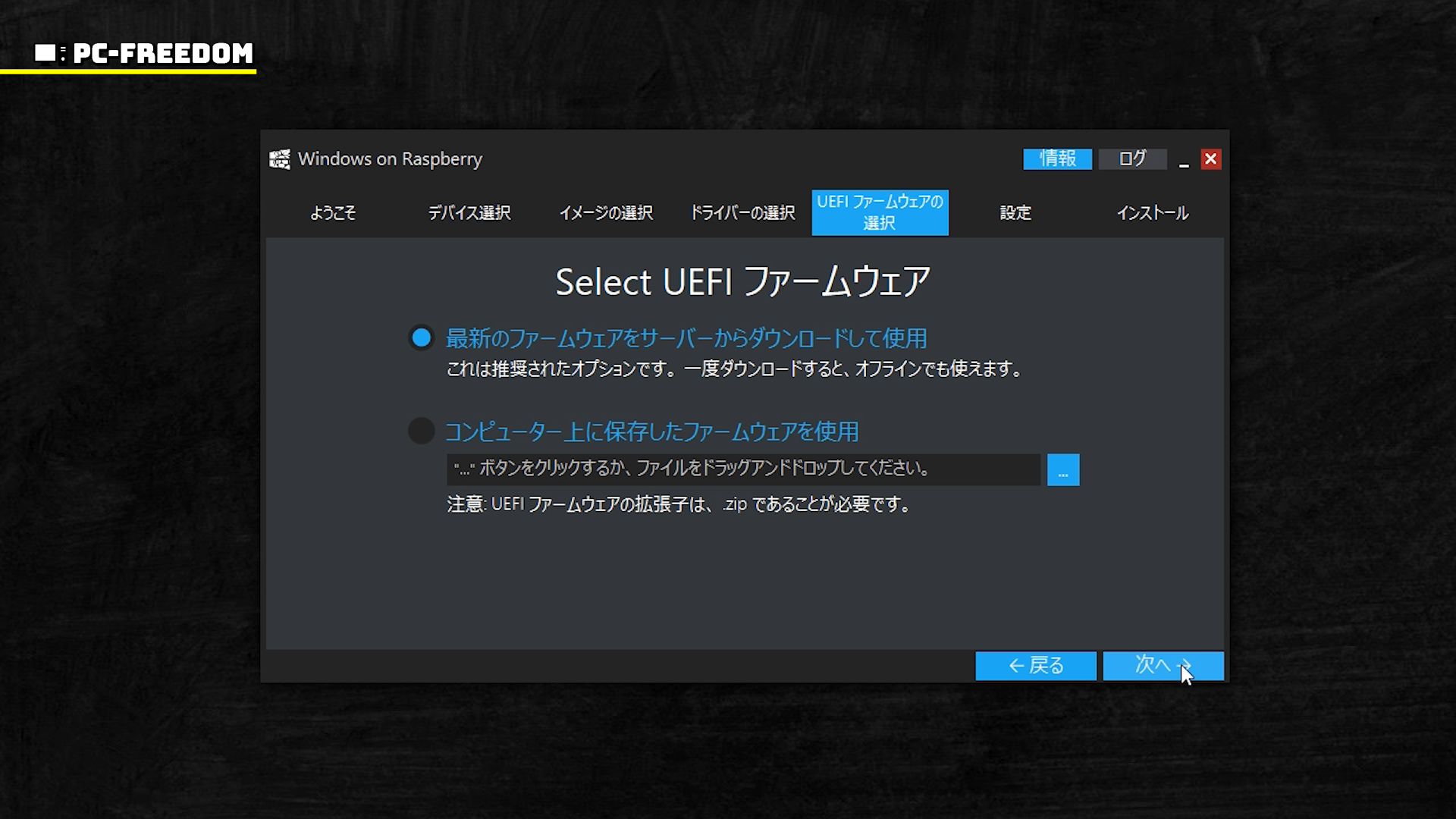 UEFI ファームウェアを選択しますが、ここもドライバーと同様で「最新のファームウェアをサーバーからダウンロードして使用」を選択します。