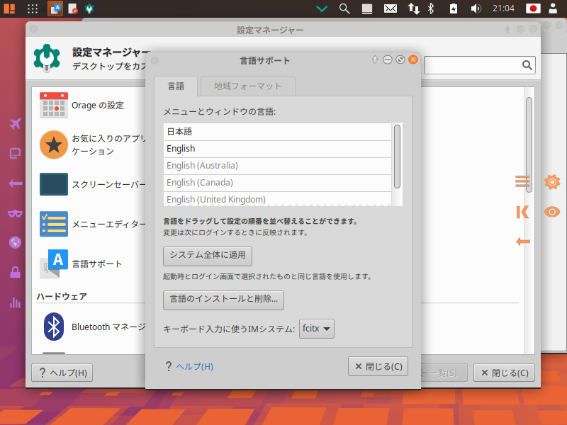 「設定マネージャー」内にある「言語サポート」で必要なパッケージを追加すればイイ。