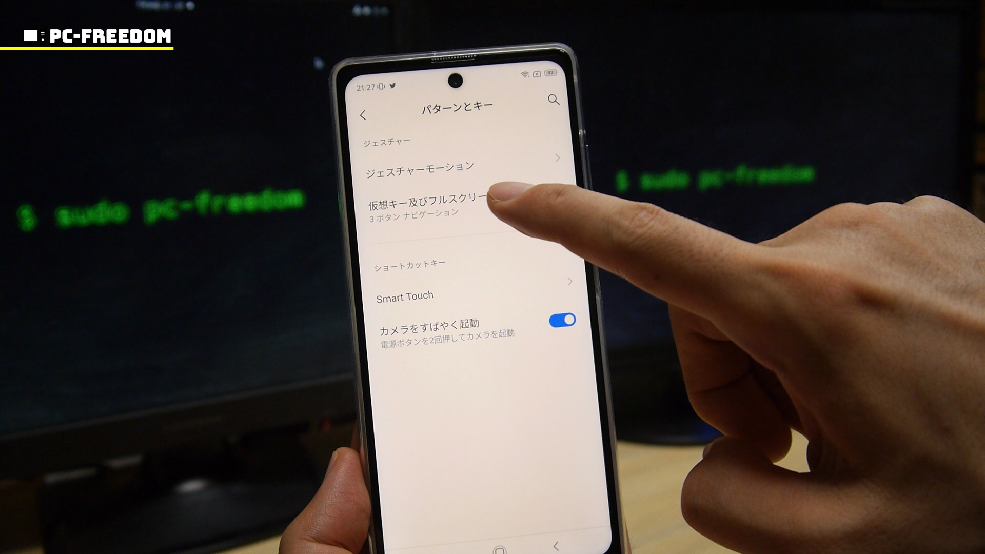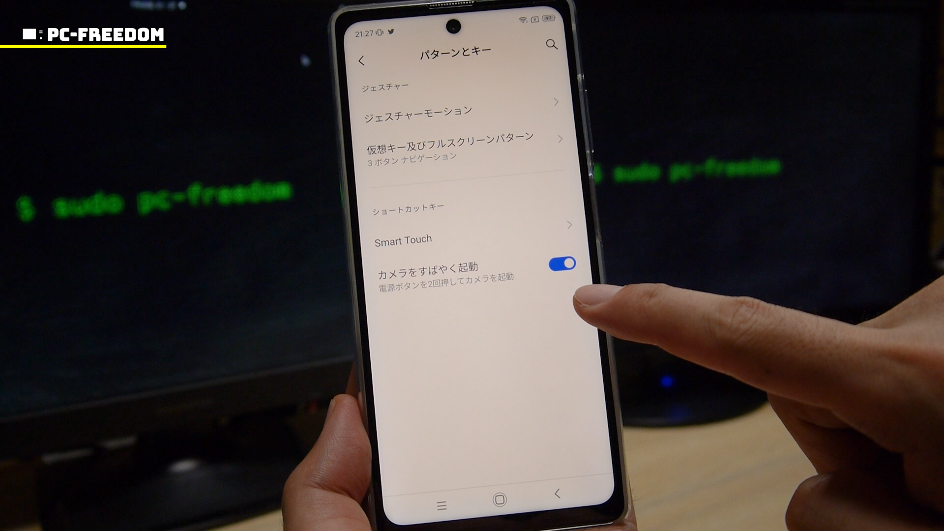 ちなみにカメラアプリの初回起動設定のときにも設定するのですが、後から設定の変更をする場合には「設定」▶︎「パターンとキー」▶︎「カメラをすばやく起動」を ON/OFF してください。