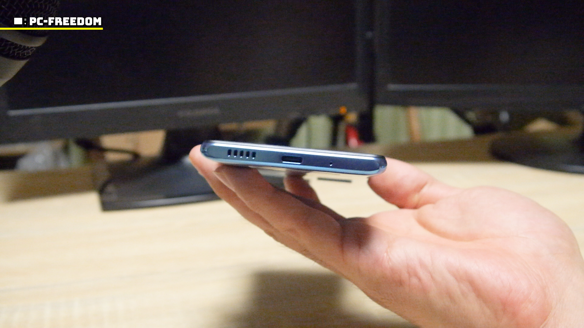 左からスピーカーと USB Type-C ポート、マイクです。