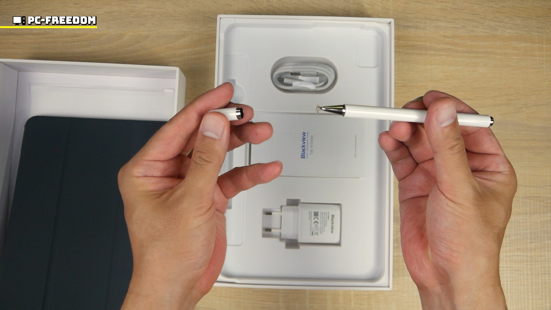 充電アダプタと Type-A to C ケーブルはもちろんのこと、専用のガラスフィルムとスタイラスペンが付属しています。最近の Blackview のタブレットでは定番になっています。