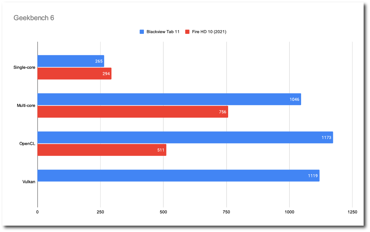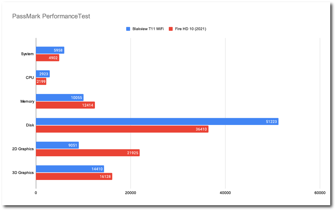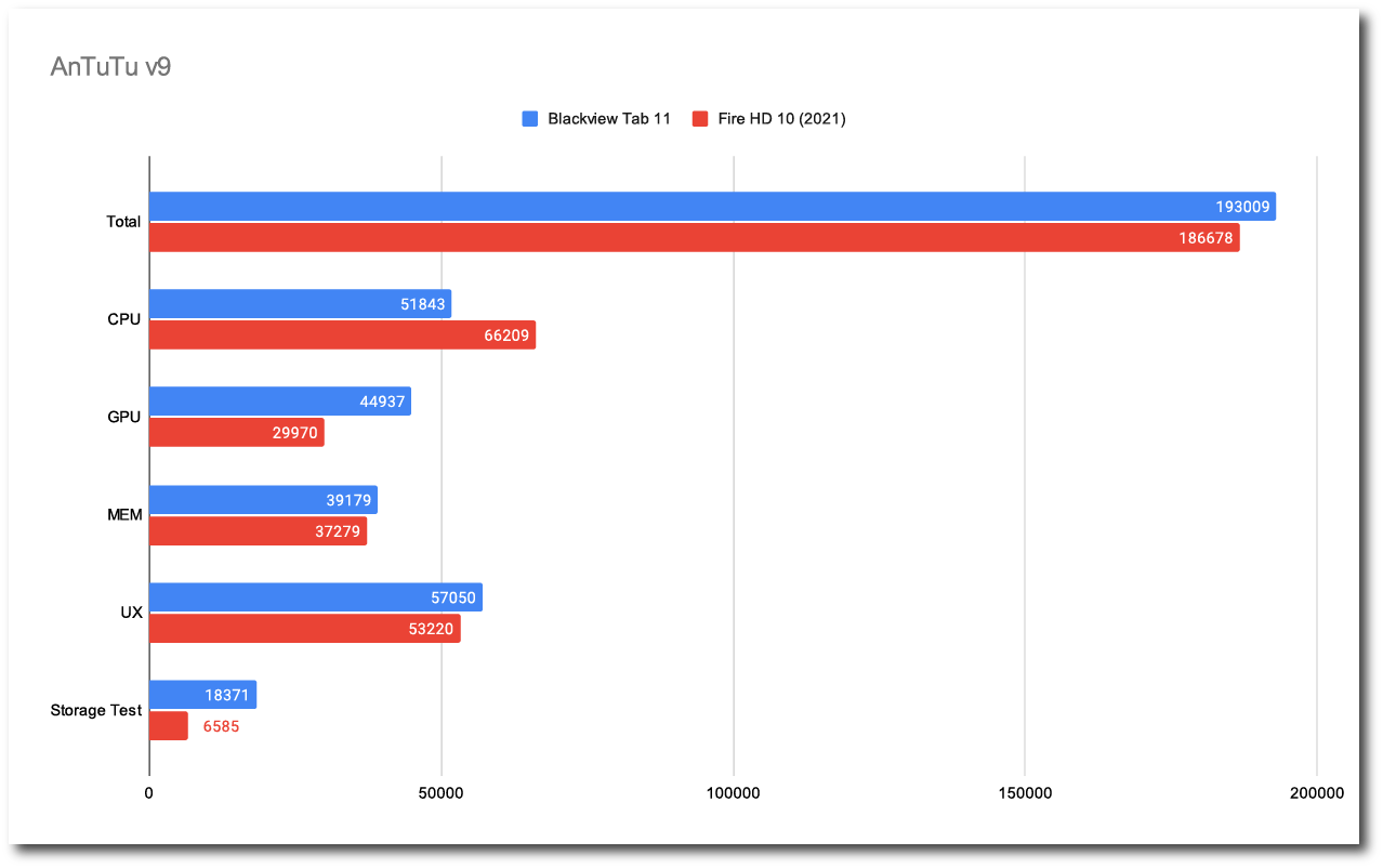 Blackview Tab 11 WiFi モデルと、同じプロセッサを搭載した Fire HD 10 との比較です。