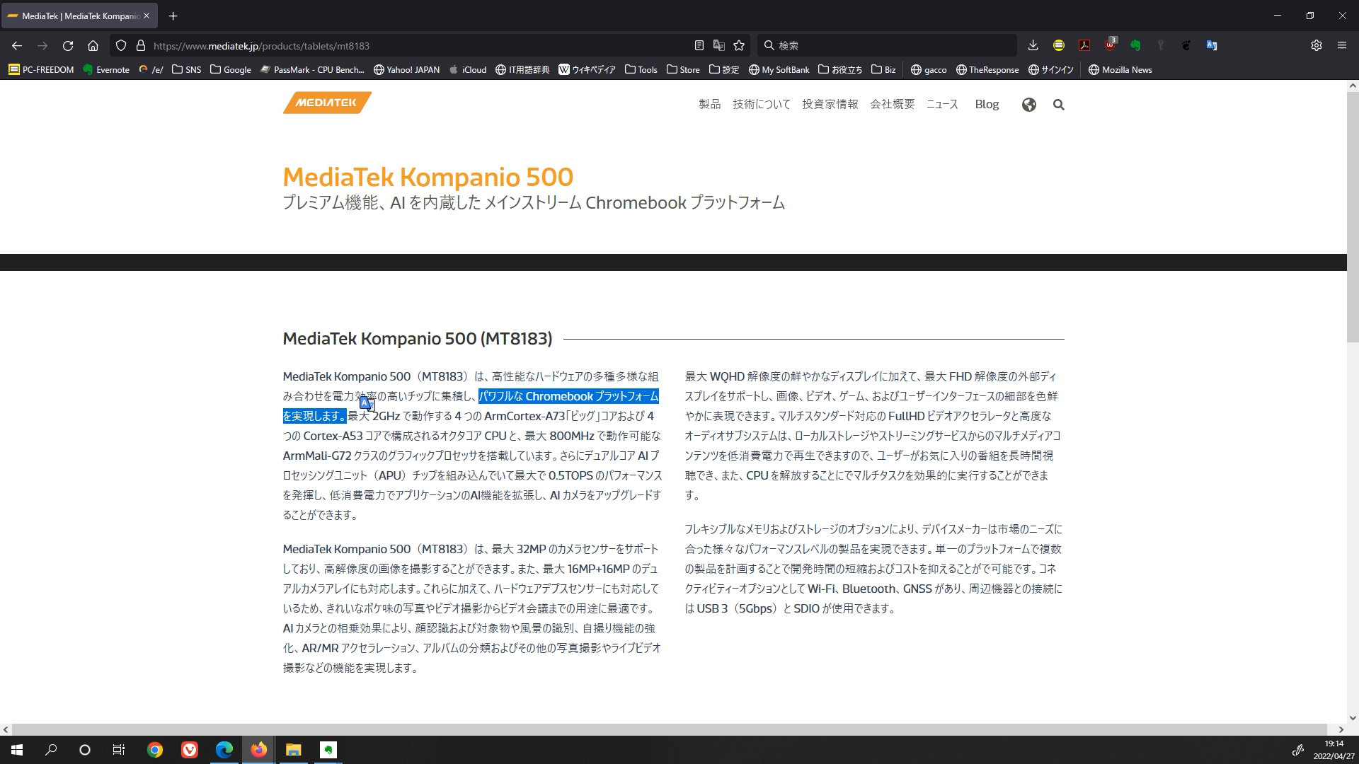 MediaTek MT8183 を更に調べてみるべく、メーカーのサイトを確認してみると「パワフルな Chromebook プラットフォームを実現します」ですって?