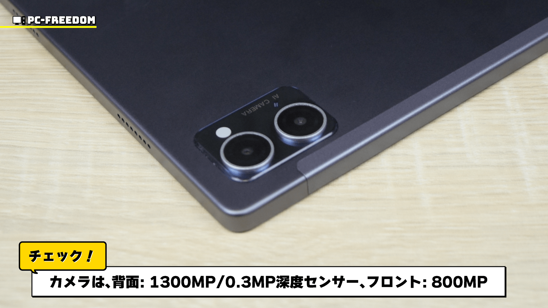 背面には 1300MP のカメラと 0.3MP の深度センサーカメラ、ちなみにフロントカメラは 800MP と数値的にはそこそこの解像度ですが、基本 Android タブレットのカメラに期待してはいけません。