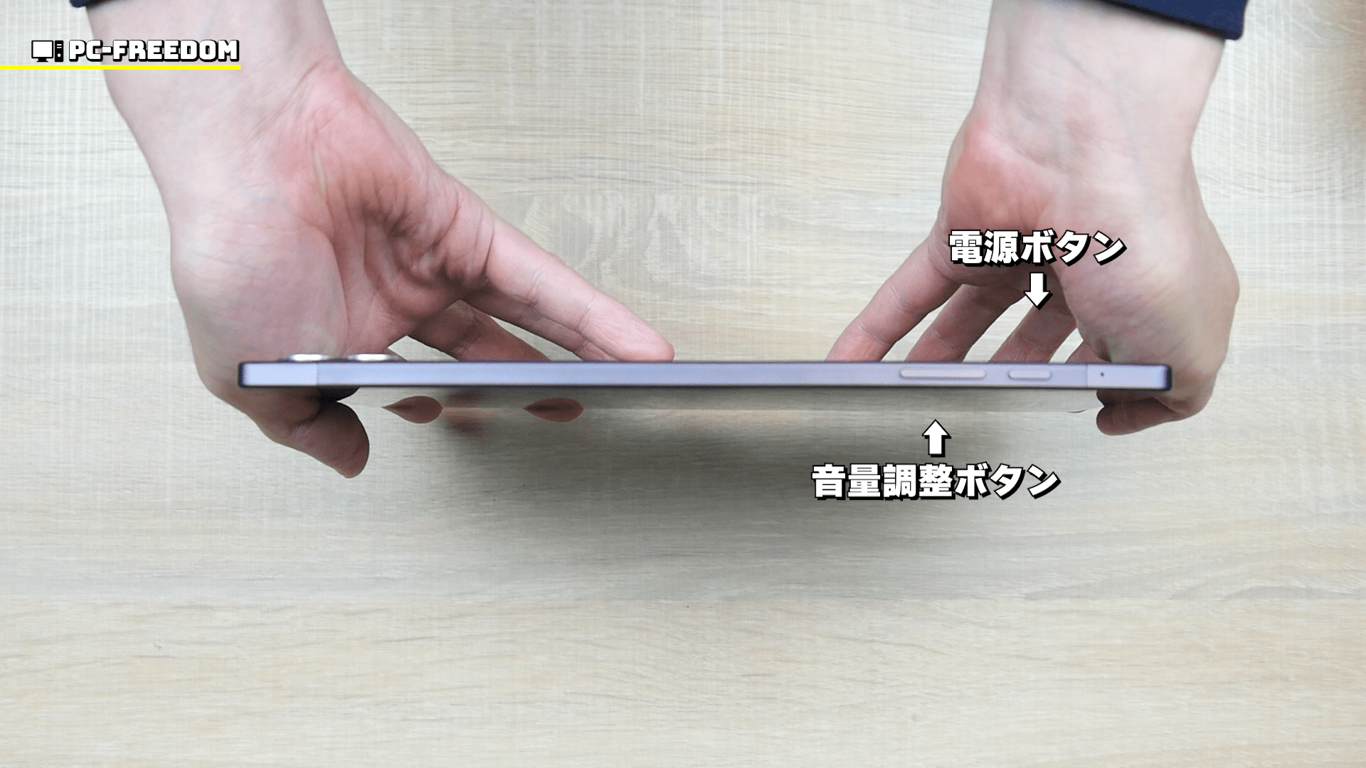 横位置にした際に上部に当たる部分に電源ボタンと音量調整ボタンがあります。