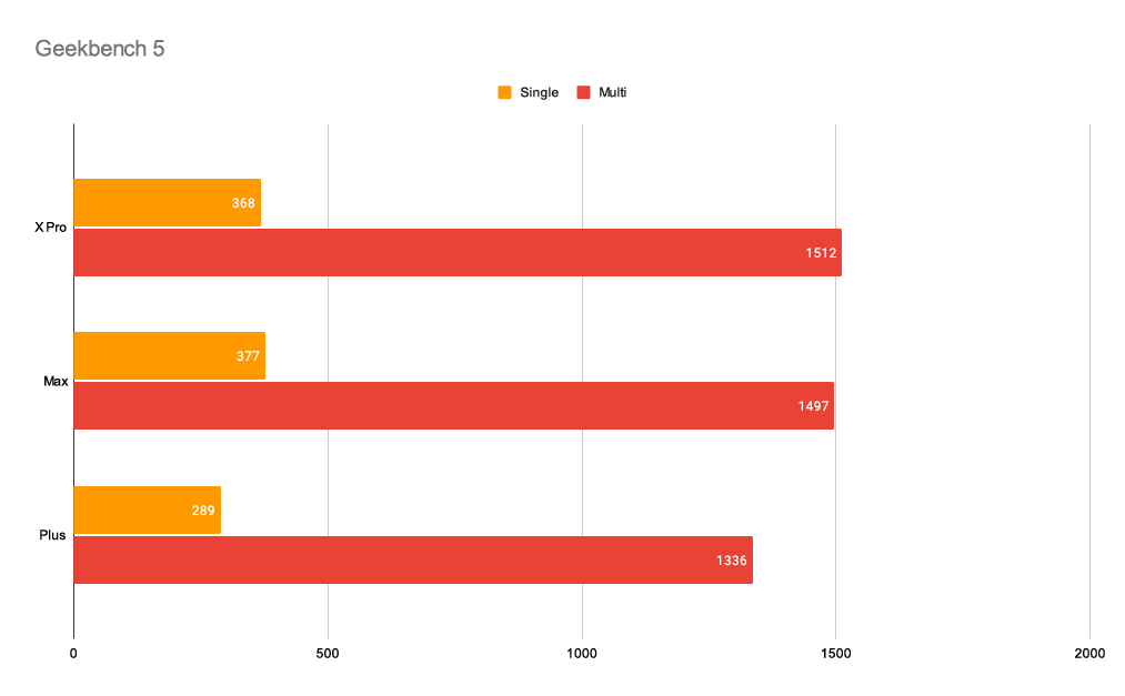 Geekbench ではシングルコアのスコアは、やっぱり2機種の間ですが、マルチコアのスコアは HiPad X Pro が最も高かったです。