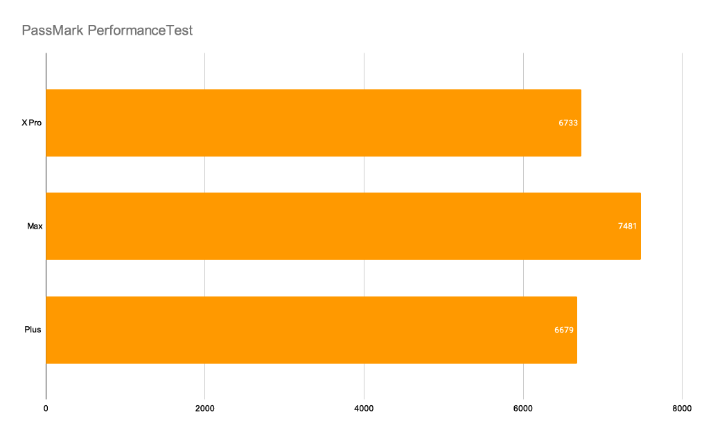 PerformanceTest では system の項目の比較だけですが、HiPad Max が最もスコアが高く、次いで X Pro、そして Plus という結果。