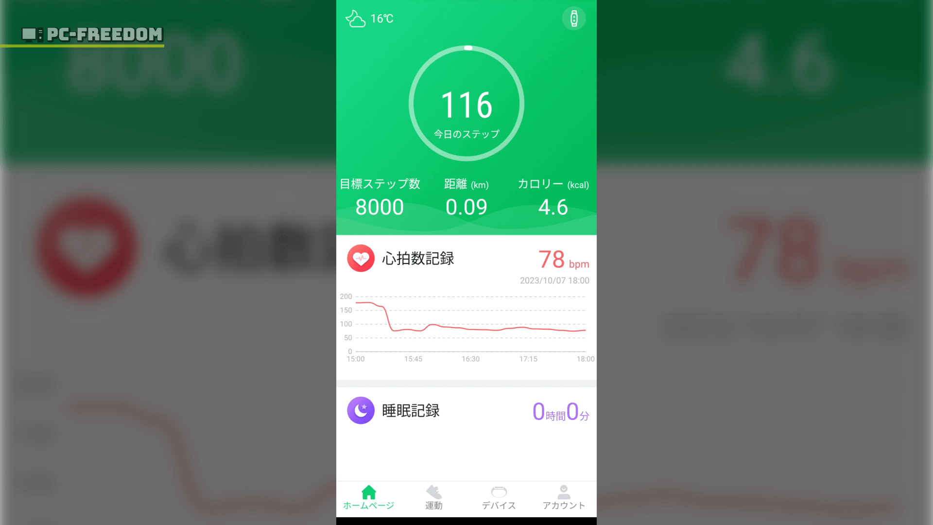右から左にスワイプすると、歩数やカロリーだったり、心拍数だったり記録されている情報を見ることができます。