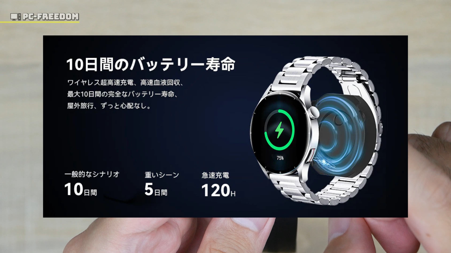 コダシマ的に、画面の綺麗さよりも、防水・防塵性能よりもこのバッテリーが長持ちするというところが、いちばんインパクトが有りました。バッテリーが切れないって、時計で最も重要なポイントじゃないですか?とにかくバッテリーが無くならないって、イメージを持ちました。