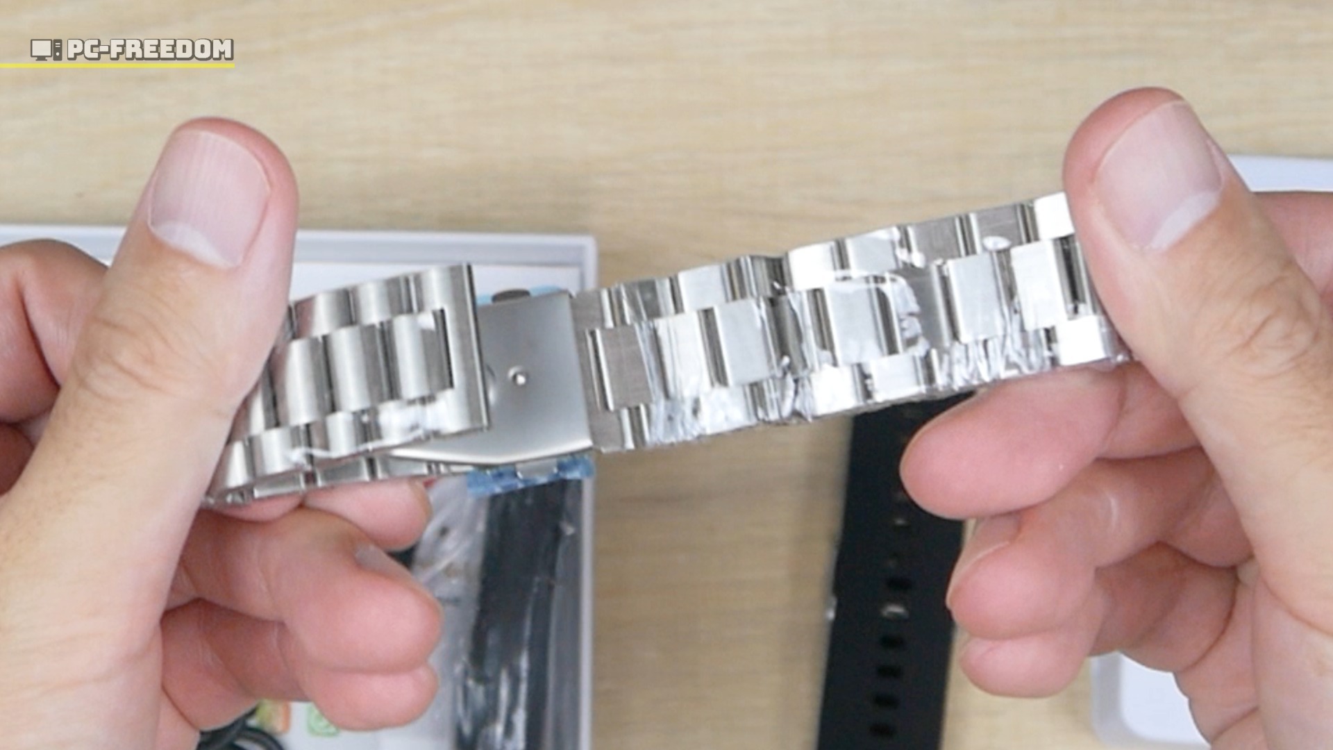 同梱品でまず目を引いたのが金属製のベルト (実測: 84g)。ベルトはステンレススチール製のしっかりしたものです。