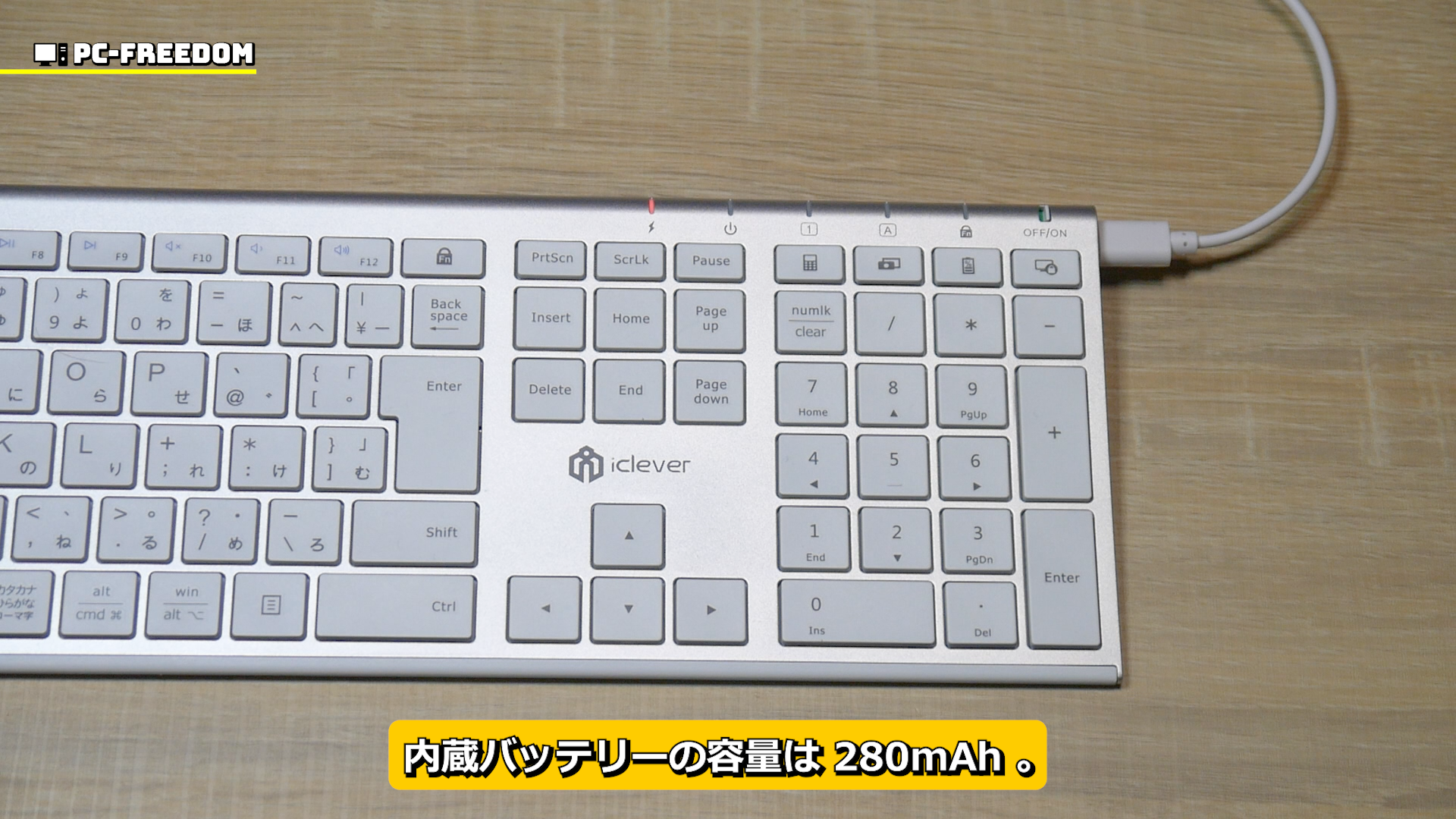 んで、このキーボードは 280mAh のバッテリー内蔵タイプのため電池交換は不要。