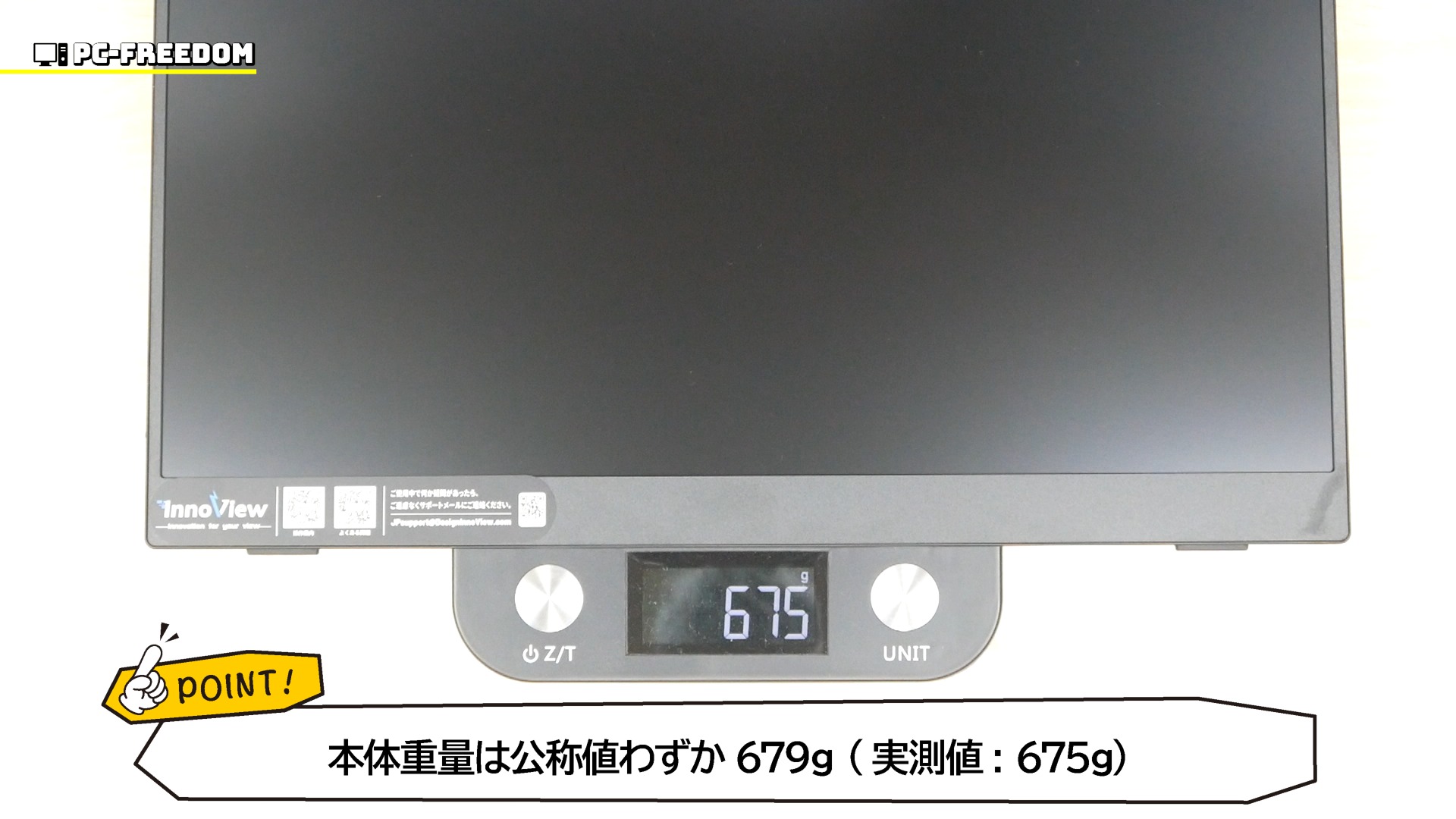 そして、このモニターの特徴の一つはその軽量さと丈夫さです。公称値わずか 679g (実測値: 675g) 、ケースを含めても 1.1kg と軽量です。