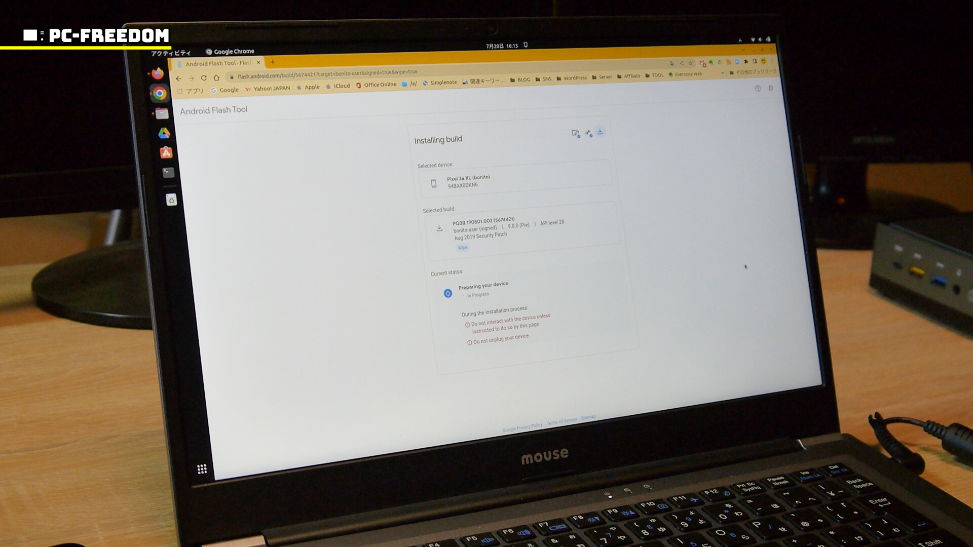 そこに Fastboot モードで起動させた Pixel 3a XL をインストーラーの起動しているパソコンに接続します。