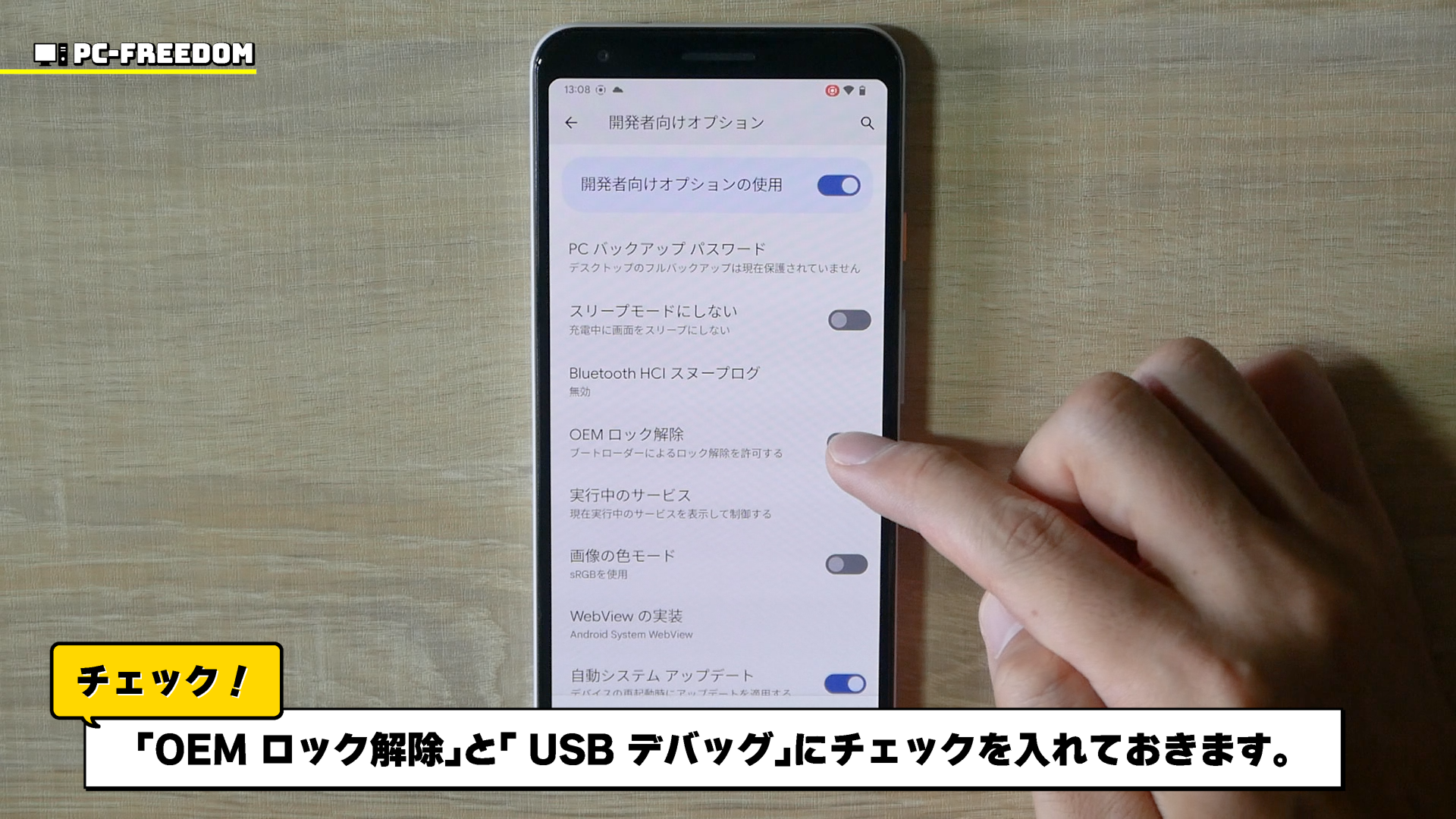 次に「開発者向けオプション」>「OEM ロック解除」と、デバイスをいじるのに必要な「 USB デバッグ」にチェックを入れておきます。