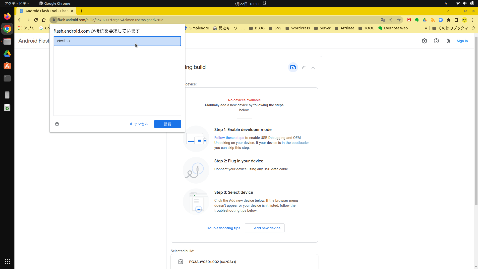 Factory Image のダウンロードページで任意のデバイスのビルドを選び、「Flash」をクリックすると Android Flash Tool へ移動します。
