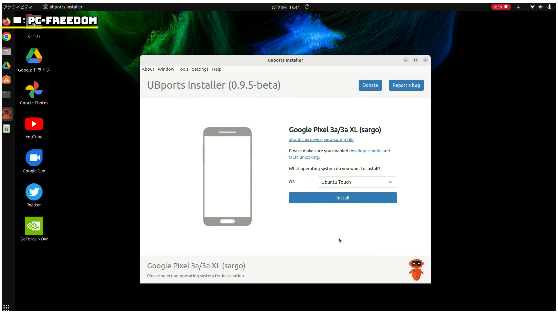 んで、インストーラーを起動した状態でパソコンに Pixel を接続すると、自動的でデバイスを認識してくれます。