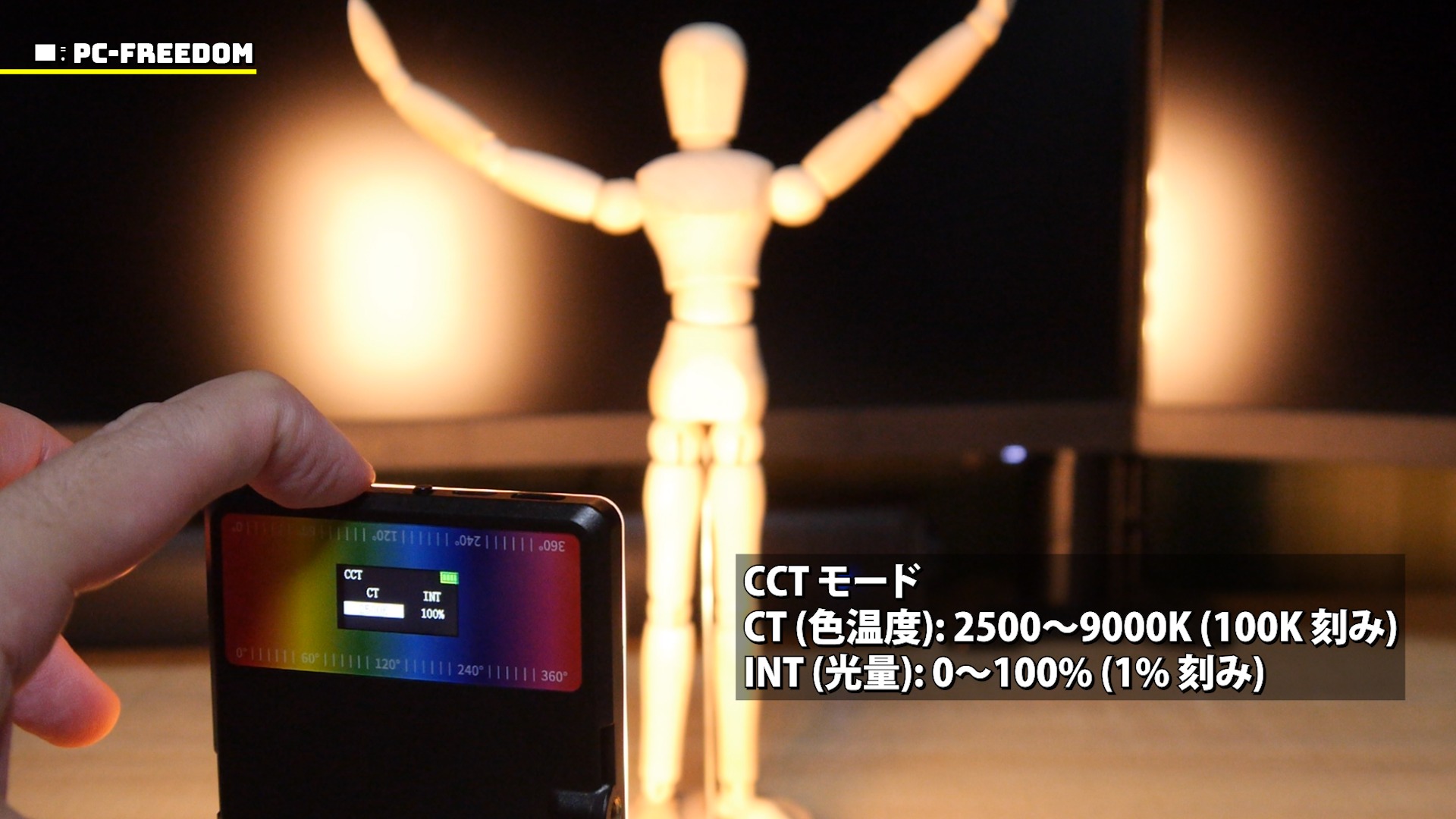 色温度は 2500〜9000K を 100K 刻みで調節でき、明るさは 0〜100% を 1% 刻みで調節することができます。