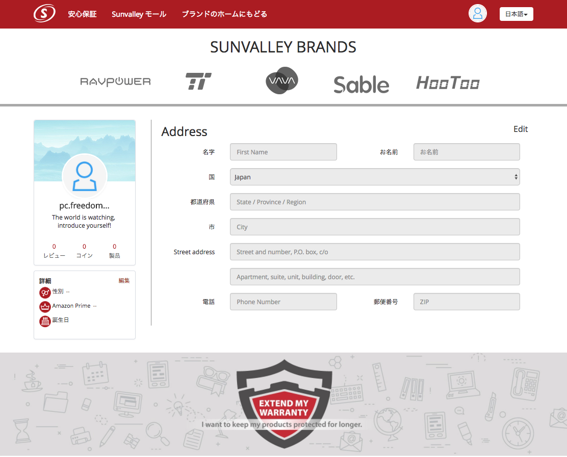 すると「SUNVALLEY BRANDS」という名前の、アカウントの詳細を登録する画面に切り替わった。