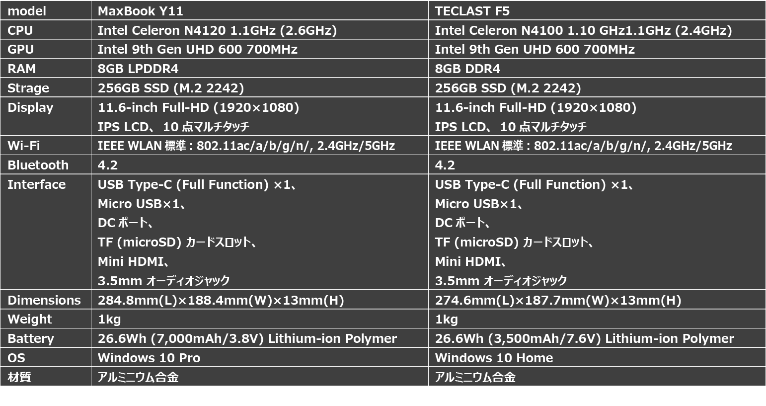 BMAX Y11 と Teclast F5 比較のまとめ。