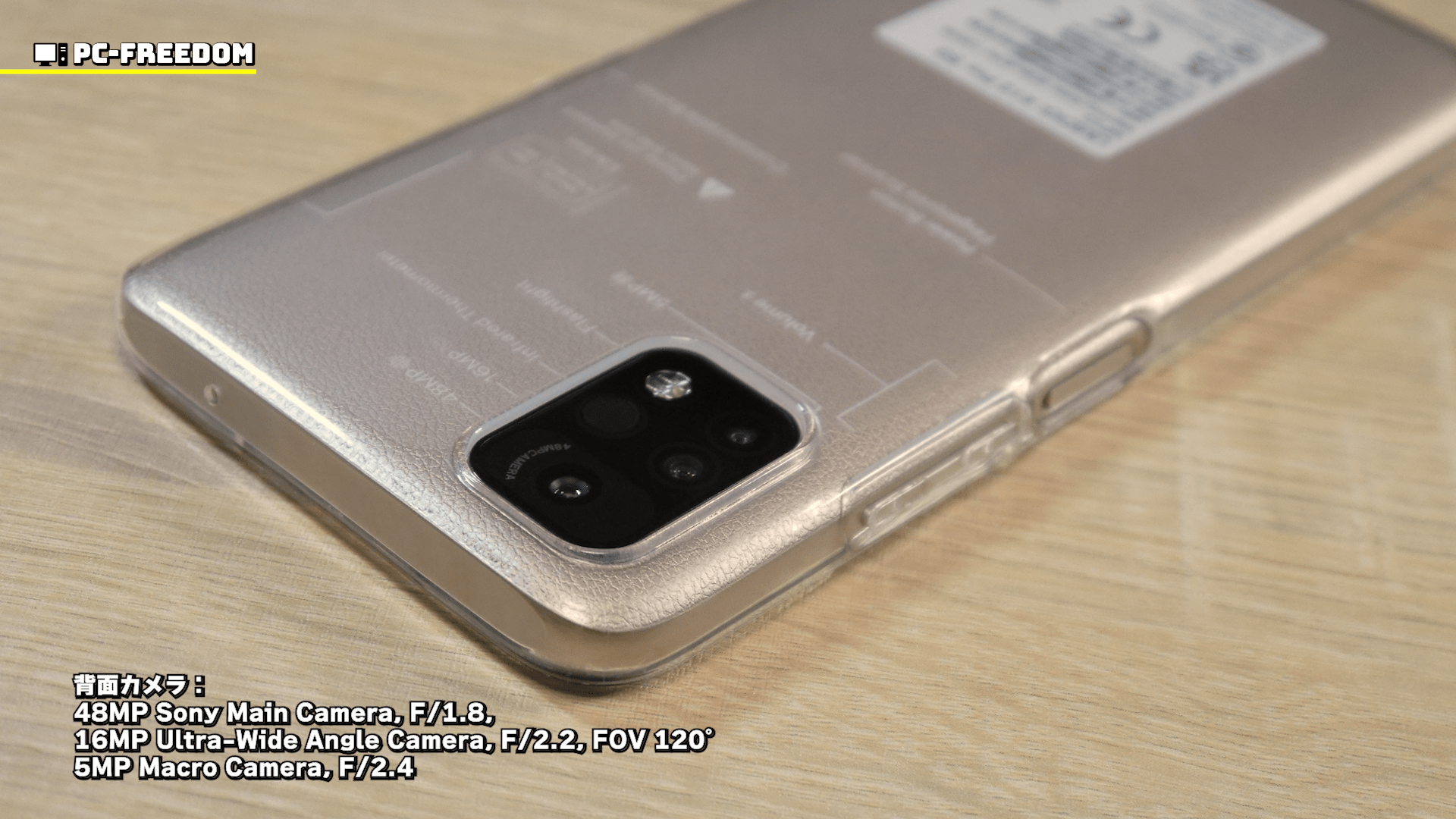 また、一見するとボタンやカメラの説明がケースに書かれているように見えますが、実はこれ、ケースの下に貼ってあるステッカーです。