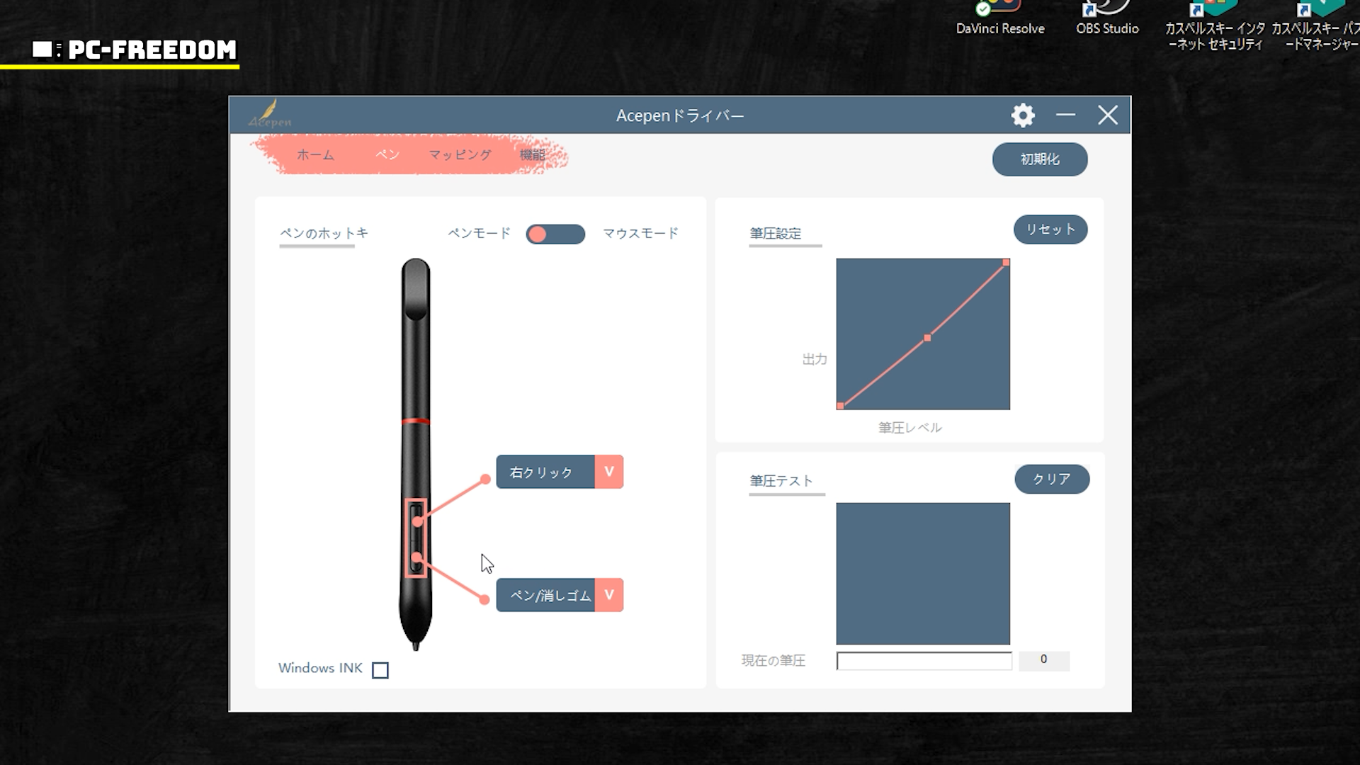 ペンの設定ではホットキーや、ペンのモード、筆圧の設定などが行なえ、筆圧のテストもできます。