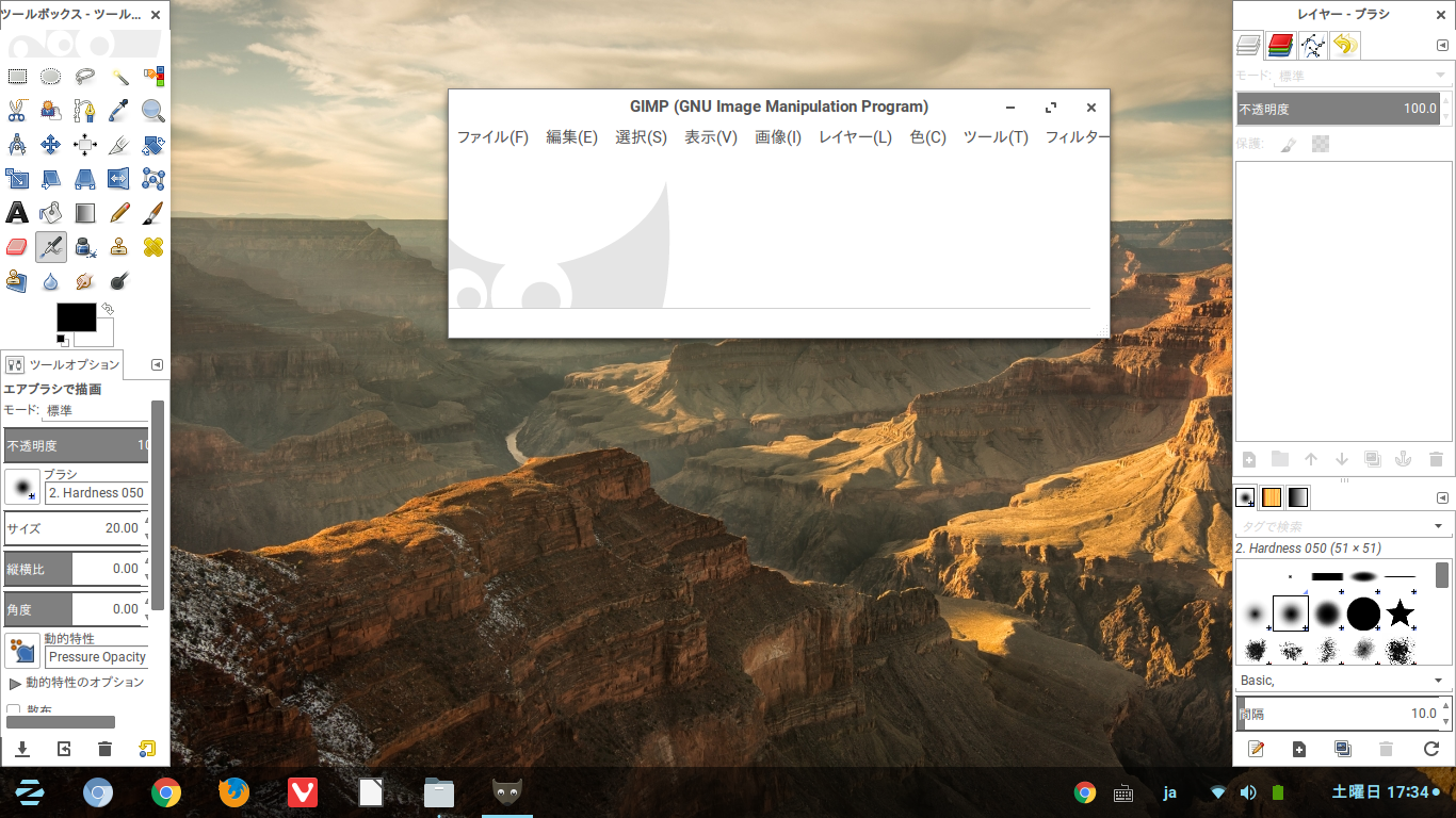 GIMP を起動すると、画像を編集するメインウィンドウの他に、筆やブラシなどのツールボックスのウィンドウ、レイヤーやチャンネルなどのウィンドウが立ち上がる。