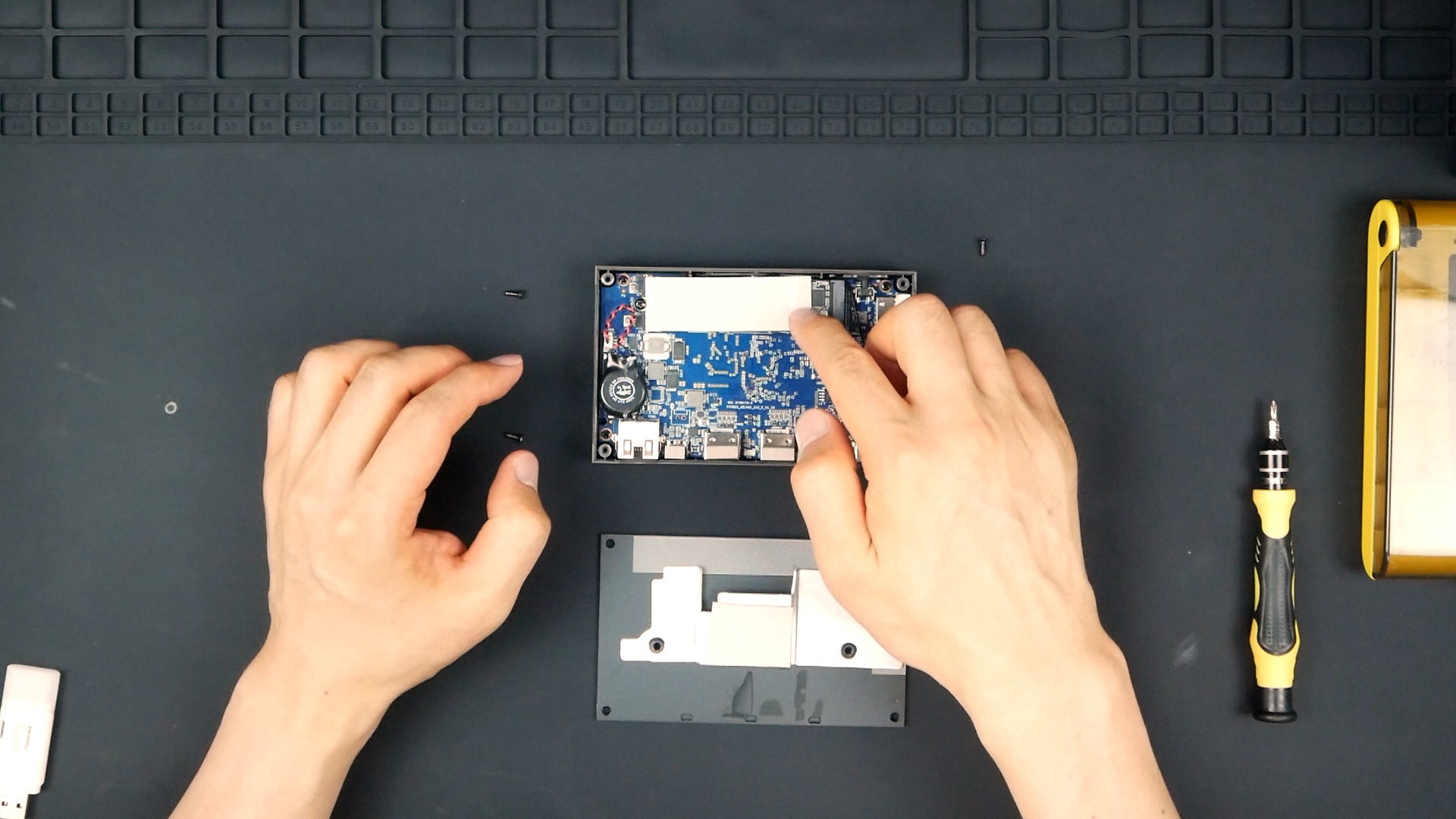 内部のネジも外してみましたが、基盤が外れません。おそらくサーマルシートとかでガッツリ張り付いているものと思われます。無理して壊すのも嫌なので、ここで分解は断念。