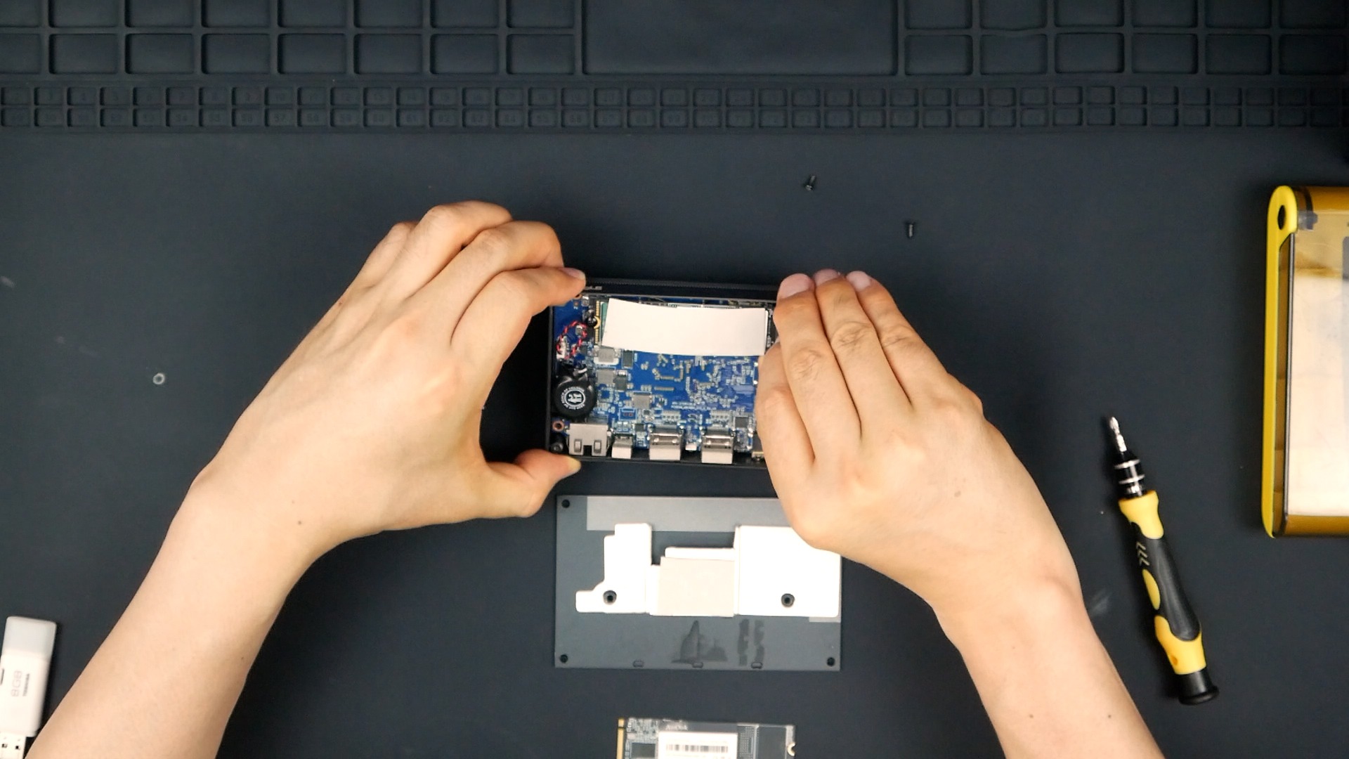 原因は、サーマルシート。サーマルシートがこんな感じに配置されていました。SSD の冷却用と、こちらはおそらく CPU の冷却用でしょう。VESAブラケットとケースの接触面積を増やして放熱効果を高めているということでしょう。