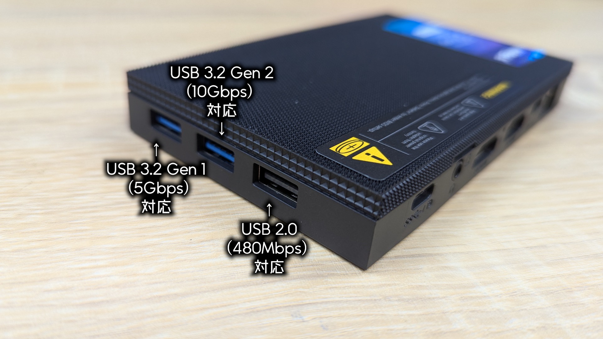 側面には、USB ポートが3つ並んでおり、左から USB 3.2 Gen 1 (5Gbps) 対応、USB 3.2 Gen 2 (10Gbps) 対応、USB 2.0 (480Mbps) 対応、が並んでいます。一番速いのが真ん中とおぼえておけばよいでしょう。