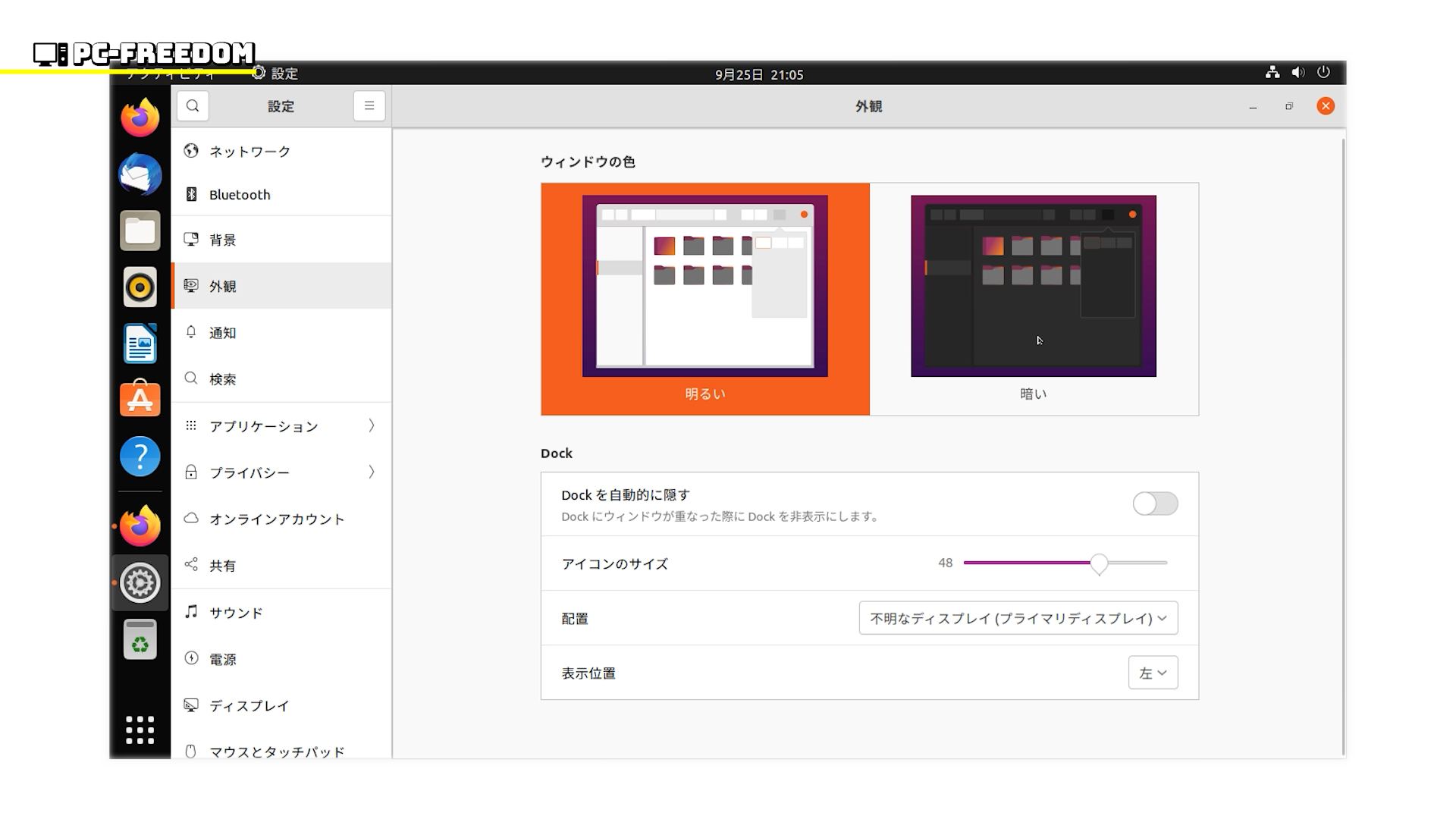そして、Ubuntu 21.10 の外観では「明るい」「暗い」の2つだけになりました。