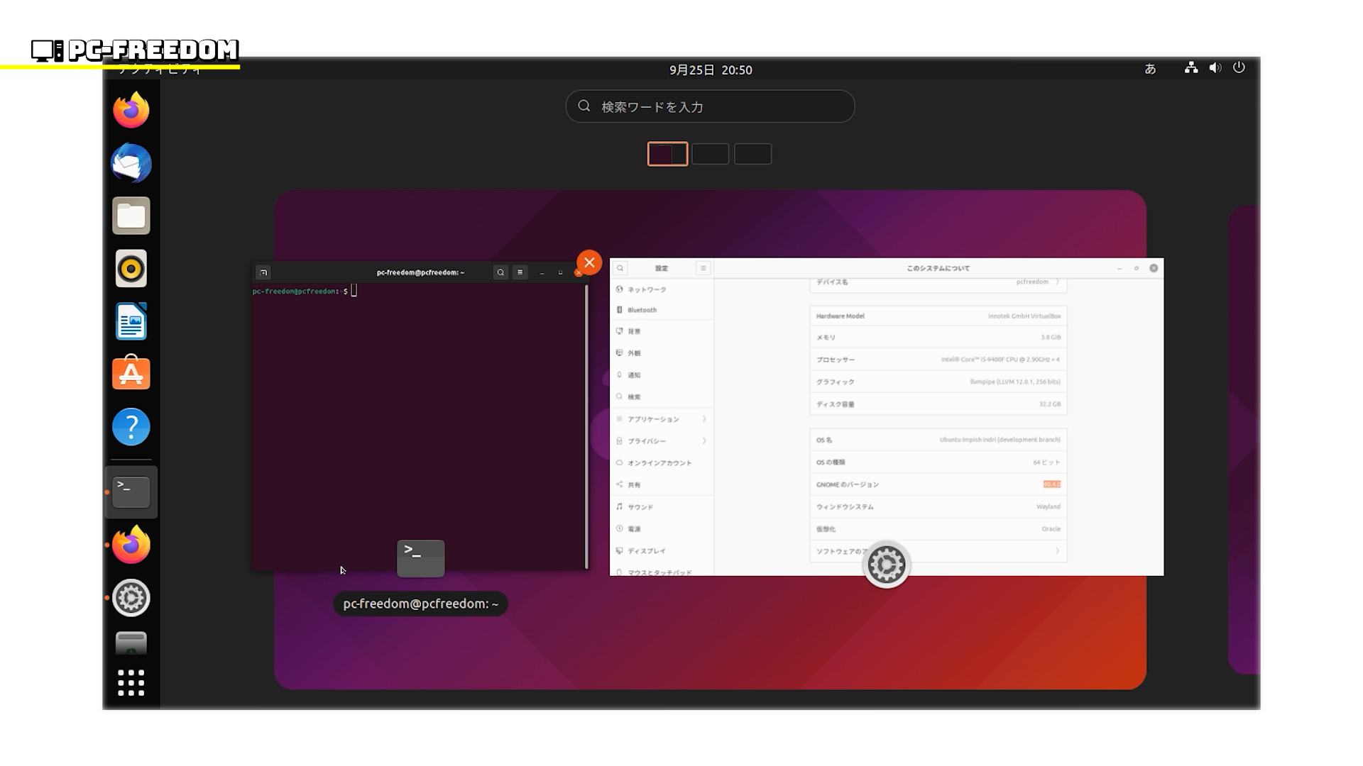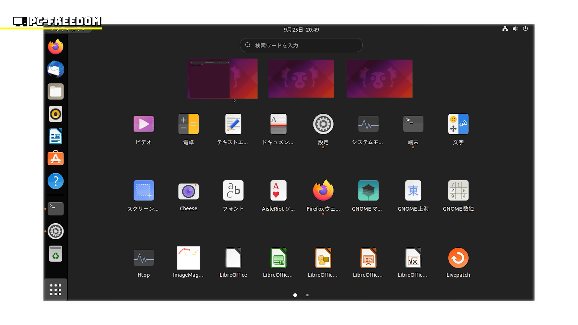「アクティビティ」をクリックするか「Super」キーをタップすると画面が表示されます。
