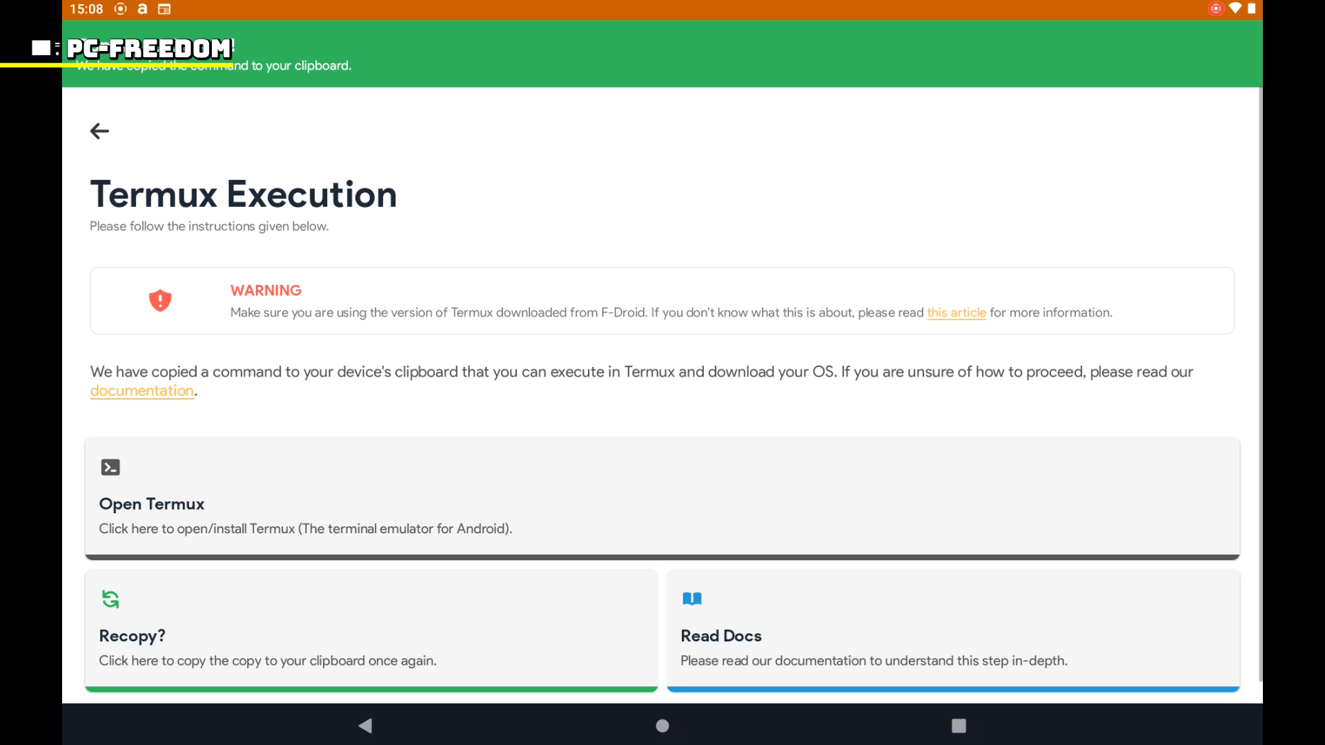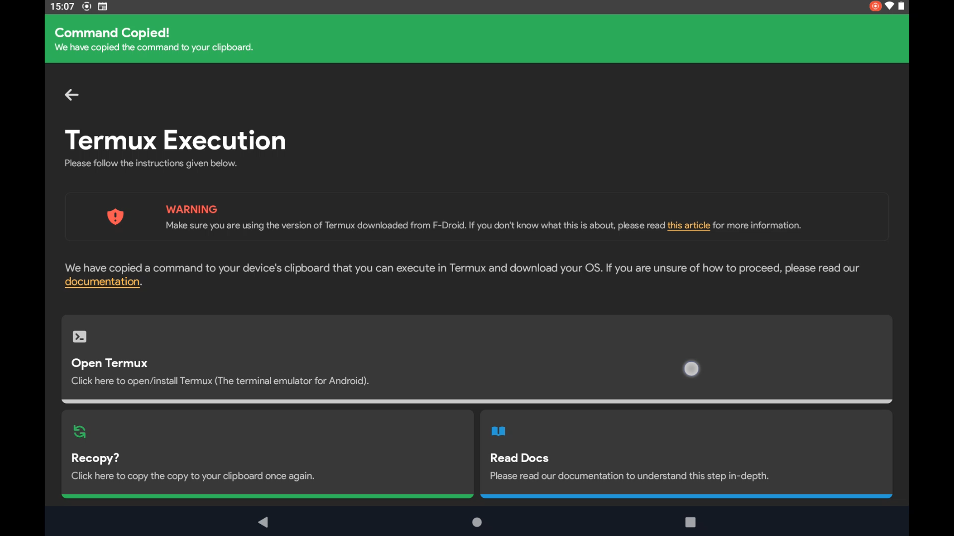 以下の画像の丈夫にある「Command Copied!」の文字からもわかるように、ココから Termux での操作が必要になります。