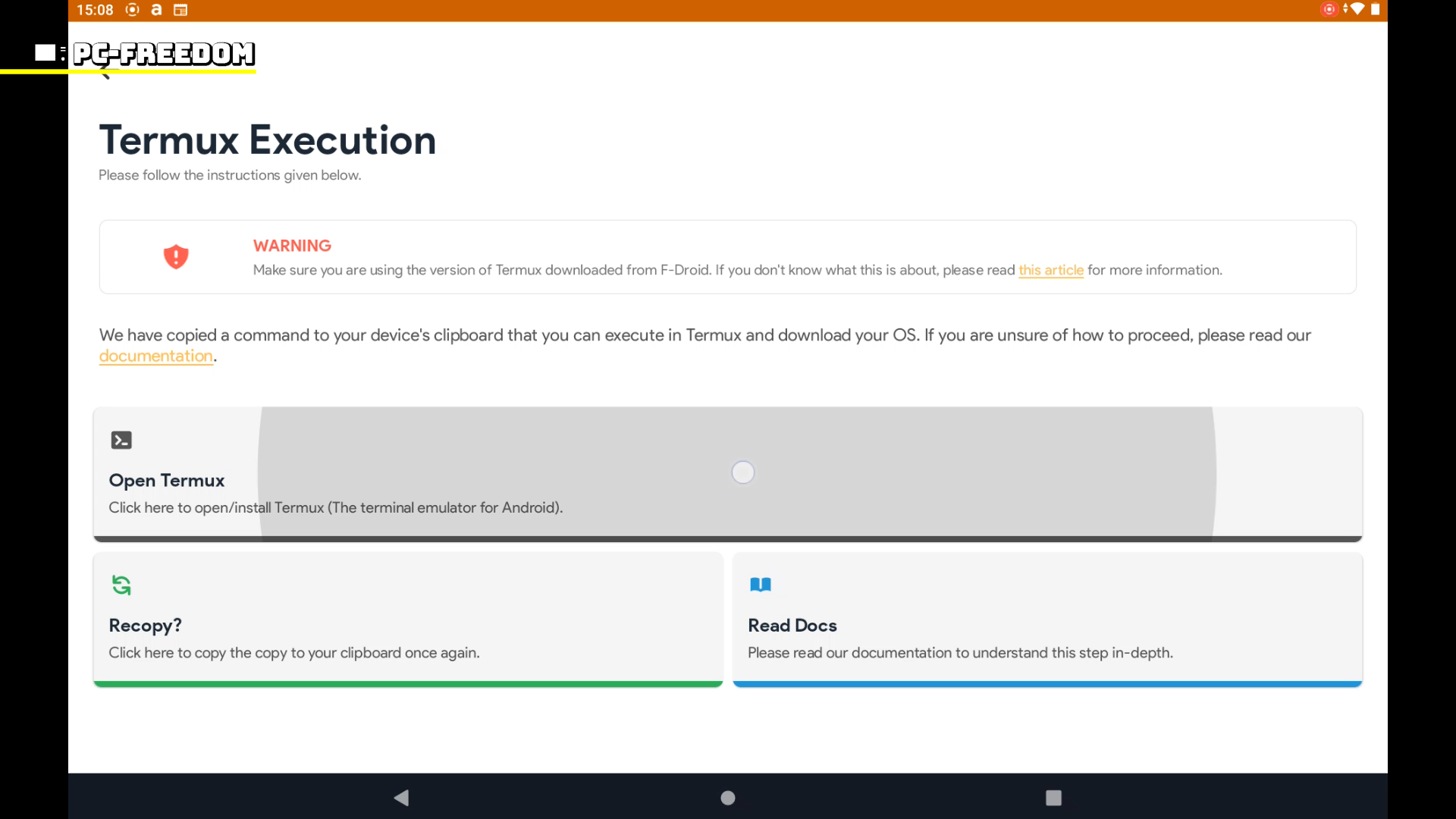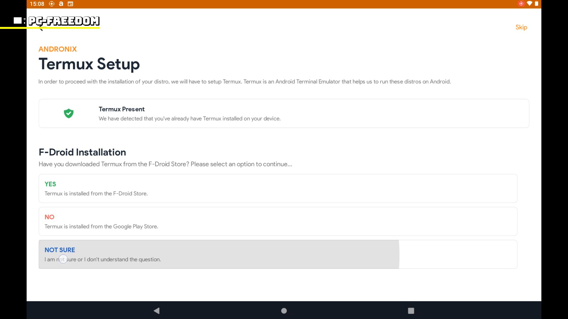 Termux のインストール後「F-Droid Installation」として、Termux をどの経路でインストールしたかの確認が求められます。
