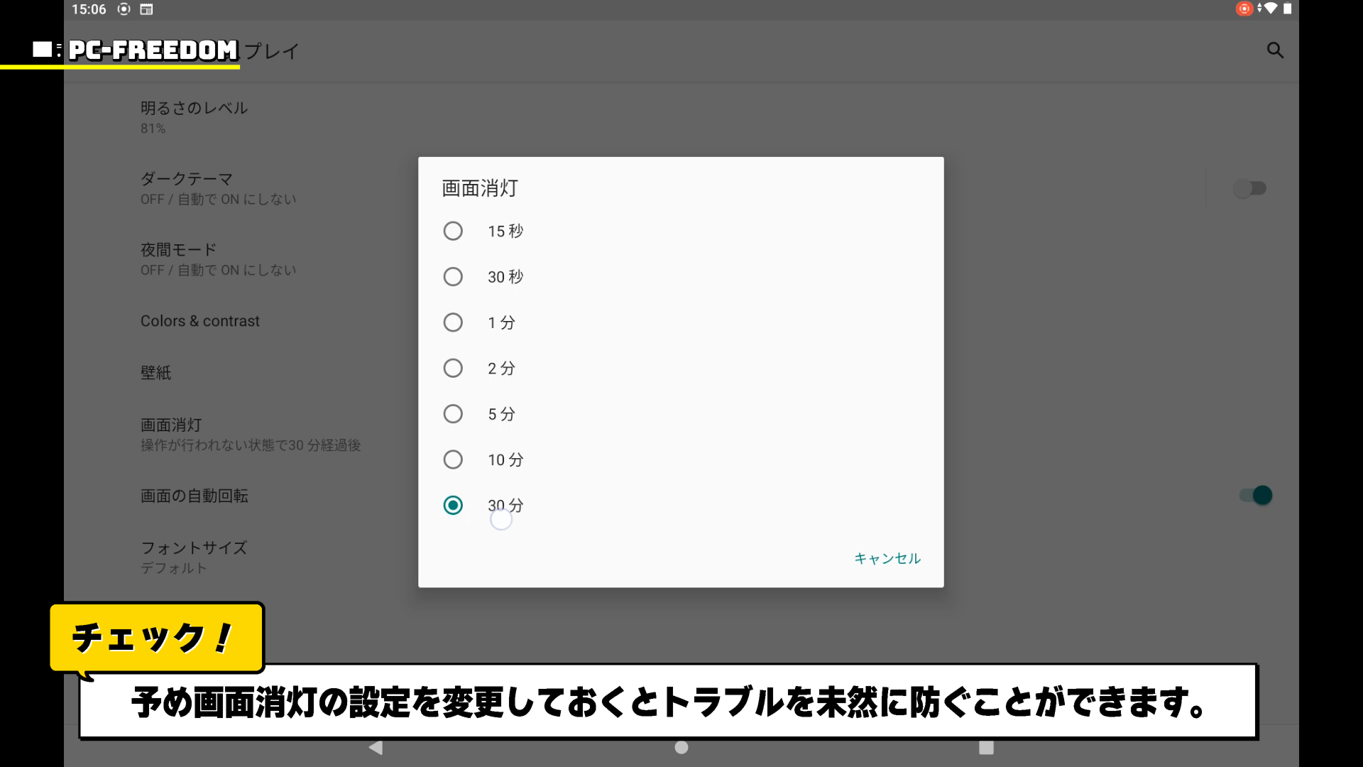 途中でスリープしてしまうと、正しくインストール出来ないことがあるようなので、予め画面消灯の設定を変更しておきましょう。