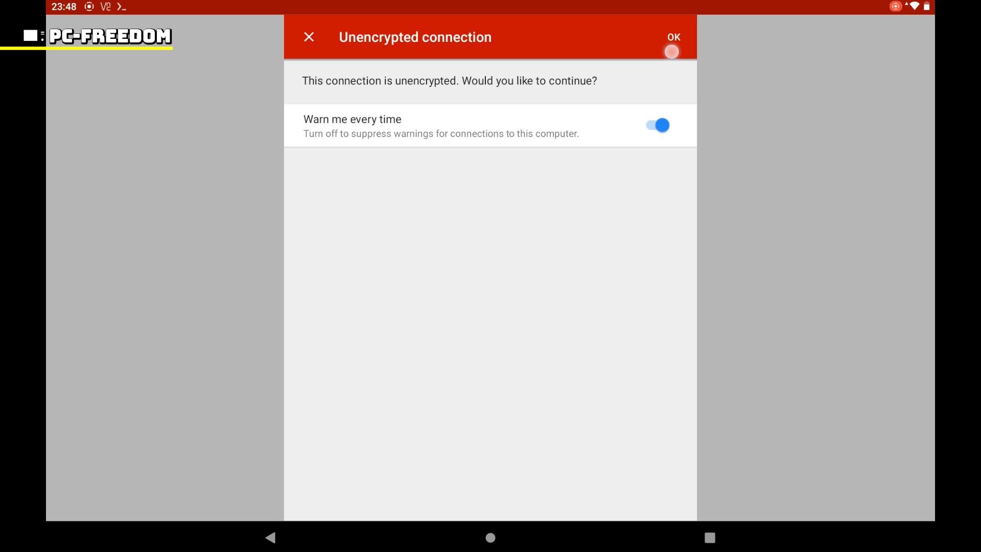 画面が切り替わり「Unencrypted connection(非暗号化接続)」のポップアップが表示されます。