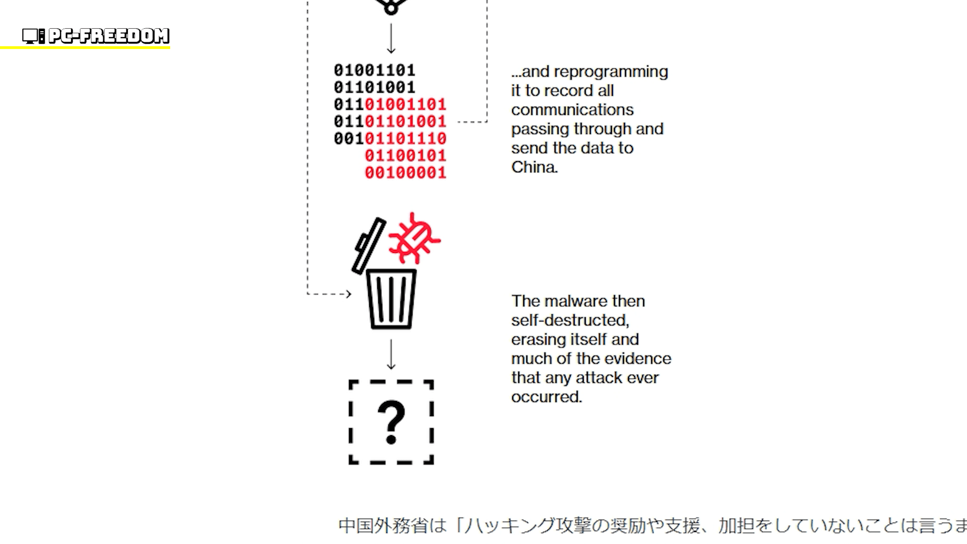 ファーウェイによるソフトウエアのアップデートに伴い悪質なコードが組み込まれ、巧みな侵入が始まったといいます。