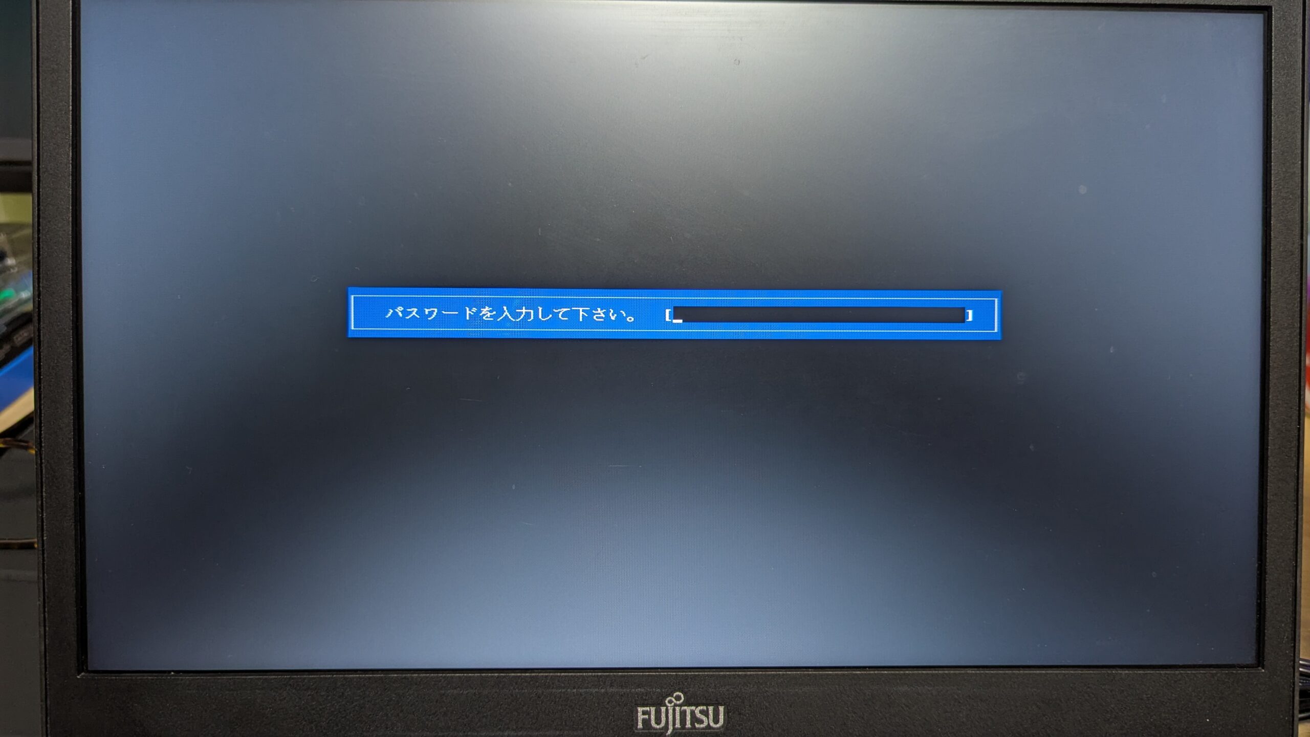 まず PC を起動し、BIOS パスワード入力画面を表示します。この画面で、わざとパスワードを3回間違えます。