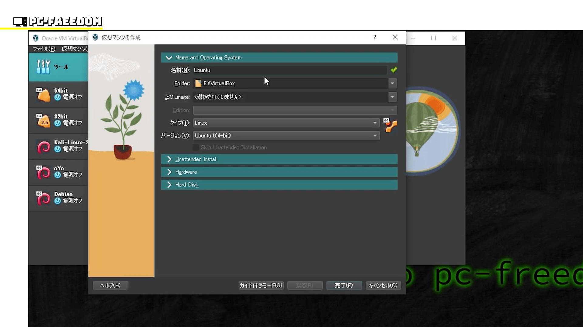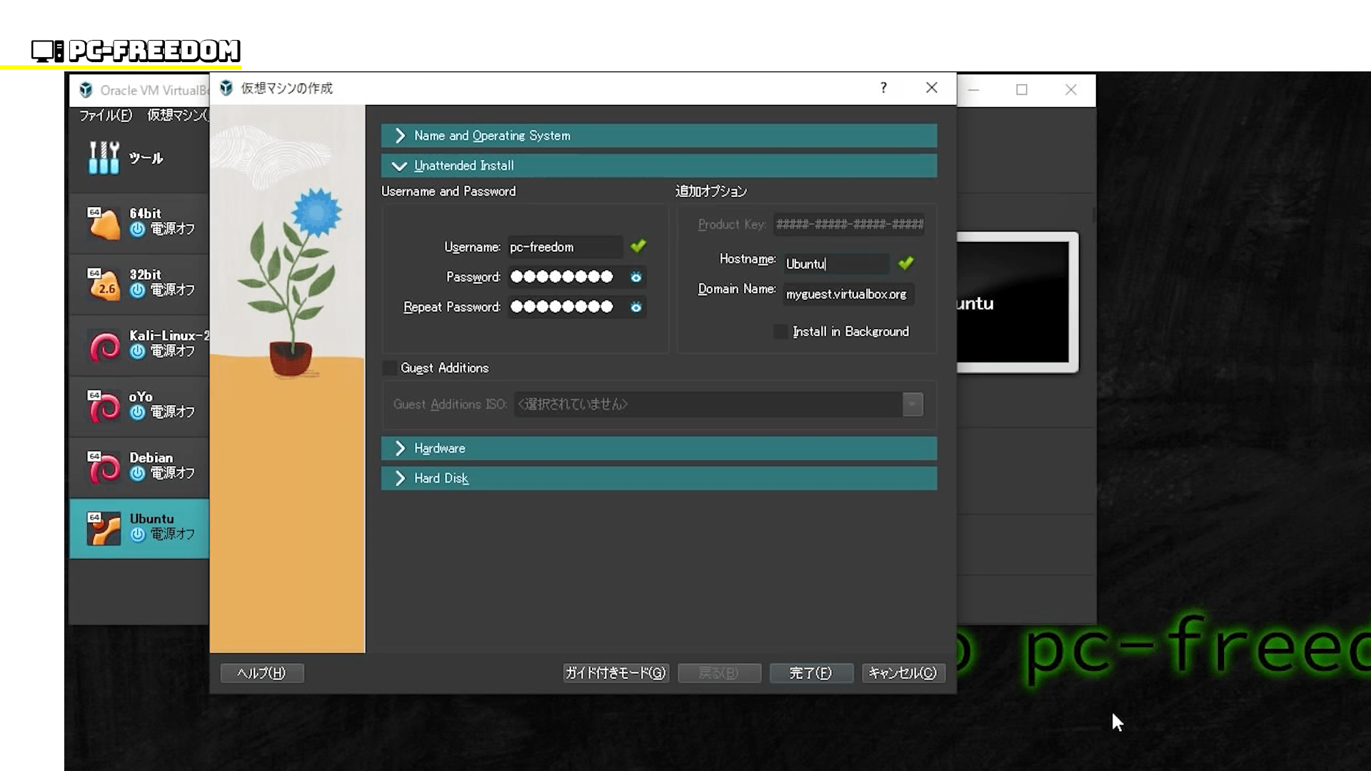 ちなみに、最新版の VirtualBox では、作成する仮想マシンの ISO ファイルやアカウントの準備が整っている場合、仮想マシンを起動させる前に登録しておくことで、自動的にインストールが始まるようになっています。