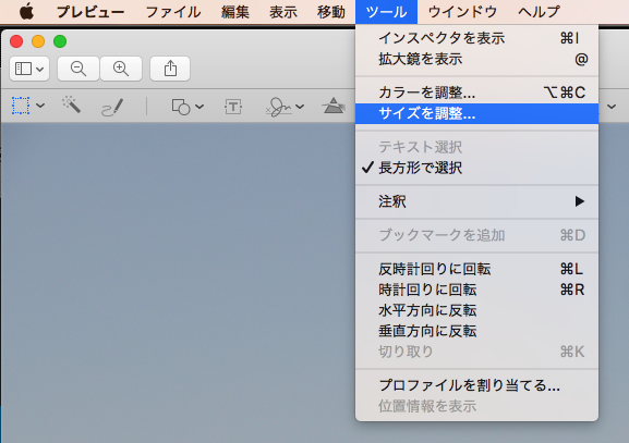 まず「プレビュー」アプリで編集したい画像を開き、メニューバーの「ツール」から「サイズを調整」をクリック。